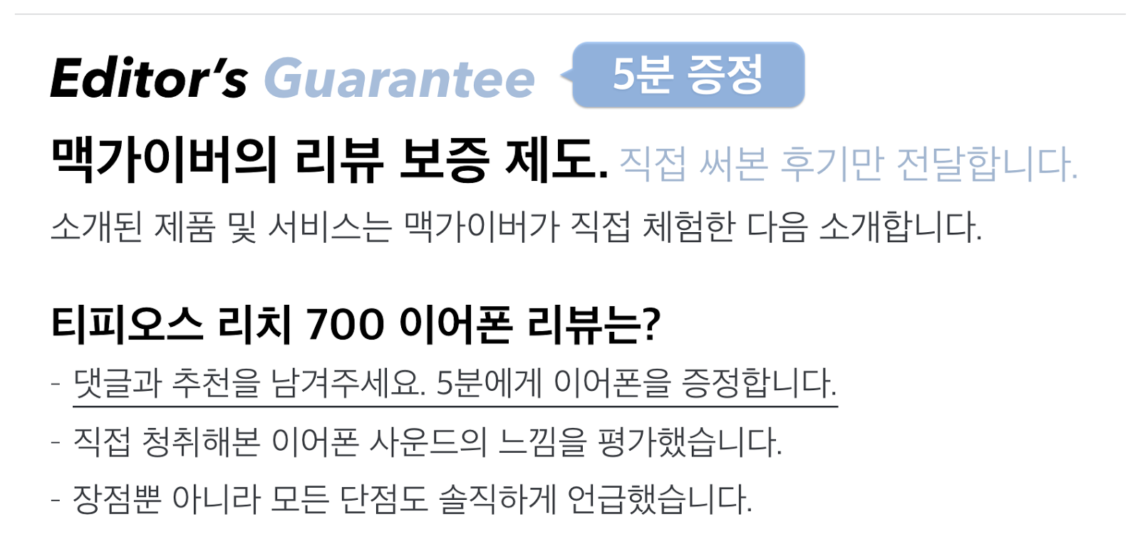 우선 글을 읽기 전에 댓글부터 다는 것도 좋다. 댓글과 추천을 남겨주신 분 가운데 5분에게 오늘 소개할 이어폰을 증정하기 때문이다. 그렇다면, 가성비 이어폰 추천 제품인 티이오스 리치700 이어폰은 어떤 제품이었을까?