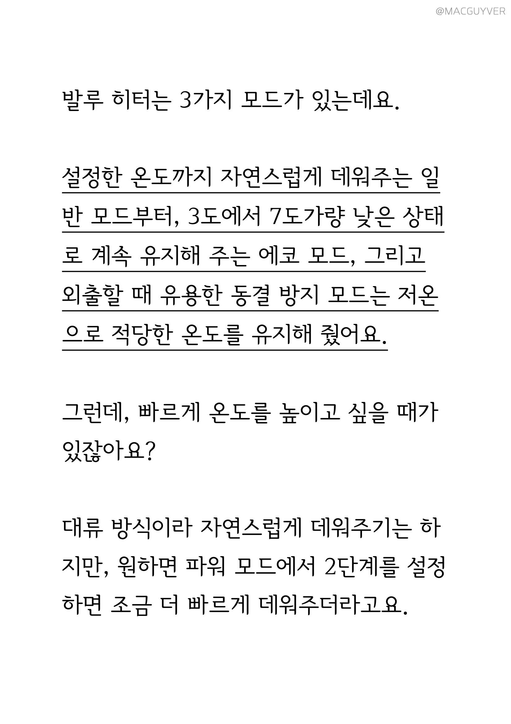 그러면 난방가전으로서의 성능은 어땠을까요? 발루 전기히터 시리즈는 대류식 난방을 활용해서 공기를 태우지 않는 장점이 있는데요. 대류 방식은 따뜻한 공기를 위로, 차가운 공기는 아래로 보내잖아요? 자연스러운 대류 현상을 이용하기 때문에 산소를 태우지 않아서 이산화탄소 발생으로 인한 환기에 대한 걱정도 없고 냄새나 연기에 대한 걱정도 없는 거죠. 거기다 소음도 없다 보니까 잠잘 때도 방해가 되지 않았는데요. 특히 겨울철에는 실내 활동이 많아지는 데다 기관지 건강을 염려하시는 분들도 많은데, 발루 히터는 기존의 난방 방식의 단점을 덜어내서 고민이 없는 거죠.