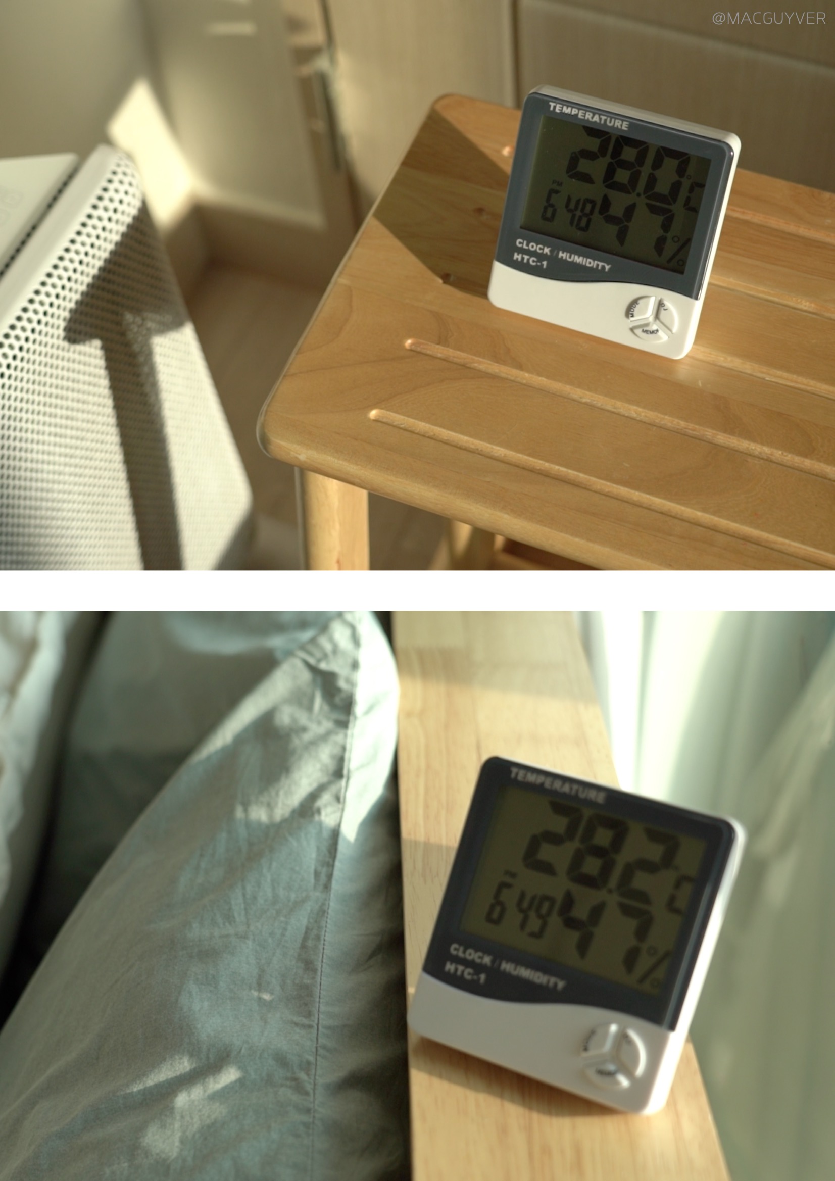 가정용 전기난로 발루 히터는 특허받은 발열체를 사용해서 20% 더 빠르게 데워준다고 하더라고요. 실제로 써보니까 예열이 필요 없을 정도로 켜자마자 온도가 올라가는 게 열화상 측정기로도 확인이 되는데요. 5평 정도 되는 방에서 10분마다 측정을 했을 때 1도씩 빠르게 올라서 변화가 체감될 정도로 온도가 빠르게 올랐어요. 놀라운 건 히터 바로 앞이 아니라 반대편 끝에서 측정했을 때도 동일하게 온도가 빠르게 올랐다는 거죠. 거기다 습도는 처음 43%부터 시작해서 마칠 때도 43%를 유지해 줘서 대류 방식의 장점을 제대로 체감할 수 있더라고요. 참고로 마이카 히터는 홀이 더 많아서 순간 발열량이 높기 때문에 더 빨리 따뜻해지는 장점이 있고, 대신 컨벡터 히터는 지속력이 더 좋은 차이가 있습니다.
