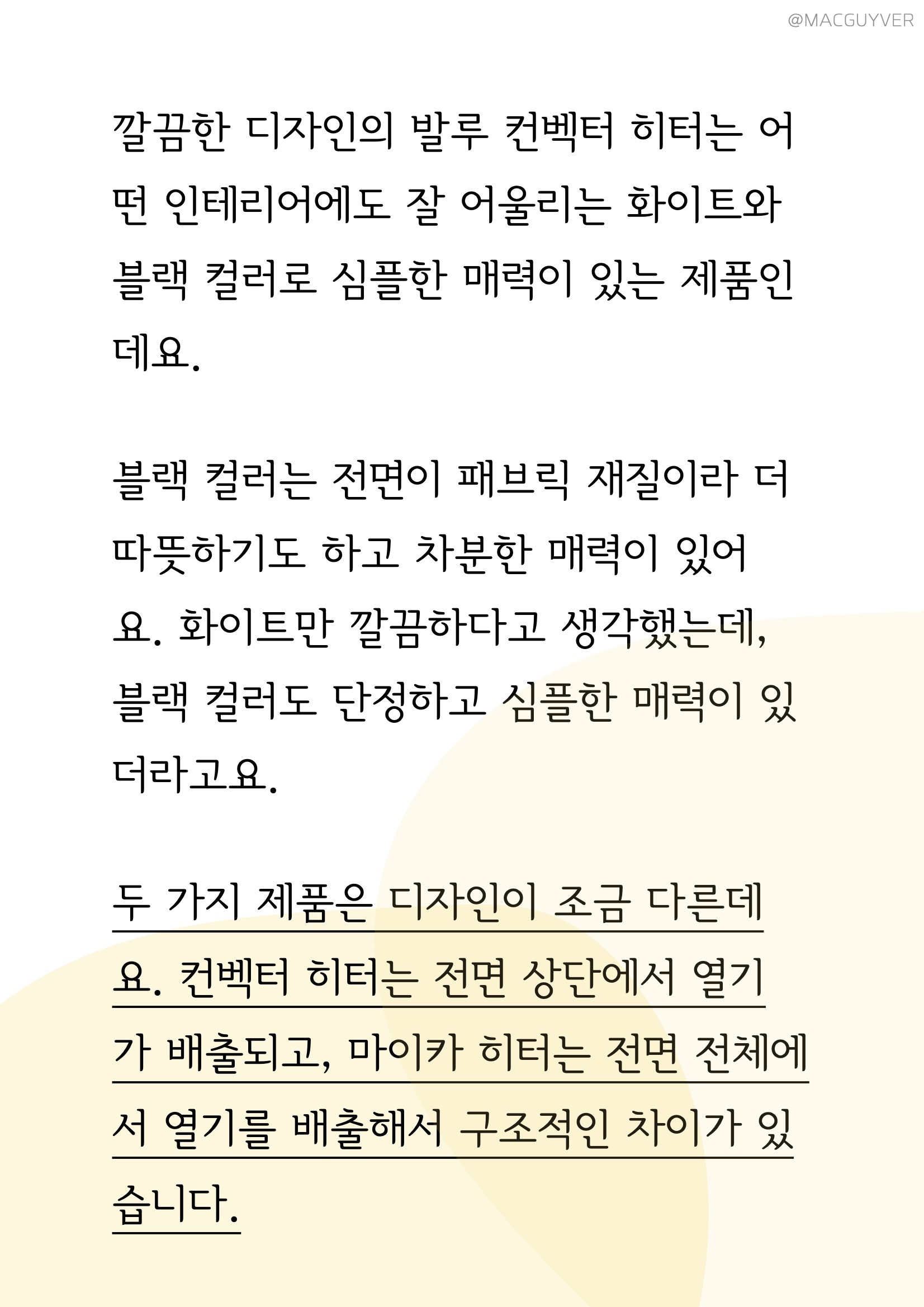 깔끔한 디자인의 발루 컨벡터 히터는 어떤 인테리어에도 잘 어울리는 화이트와 블랙 컬러로 심플한 매력이 있는 제품인데요. 블랙 컬러는 전면이 패브릭 재질이라 더 따뜻하기도 하고 차분한 매력이 있어요. 화이트만 깔끔하다고 생각했는데, 블랙 컬러도 단정하고 심플한 매력이 있더라고요. 컨벡션히터 두 가지 제품은 디자인이 조금 다른데요. 컨벡터 히터는 전면 상단에서 열기가 배출되고, 마이카 히터는 전면 전체에서 열기를 배출해서 구조적인 차이가 있습니다.