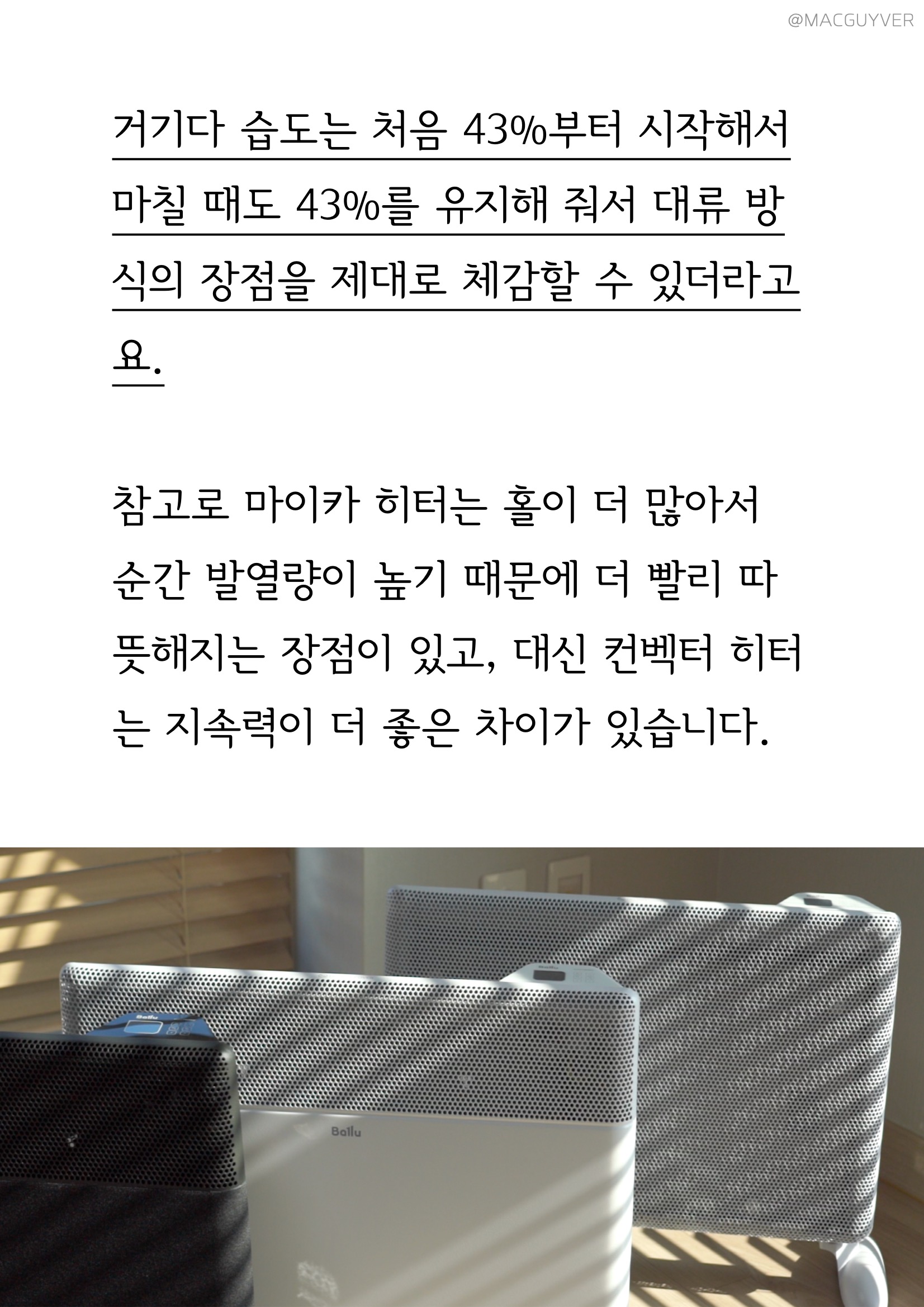 가정용 전기난로 발루 히터는 특허받은 발열체를 사용해서 20% 더 빠르게 데워준다고 하더라고요. 실제로 써보니까 예열이 필요 없을 정도로 켜자마자 온도가 올라가는 게 열화상 측정기로도 확인이 되는데요. 5평 정도 되는 방에서 10분마다 측정을 했을 때 1도씩 빠르게 올라서 변화가 체감될 정도로 온도가 빠르게 올랐어요. 놀라운 건 히터 바로 앞이 아니라 반대편 끝에서 측정했을 때도 동일하게 온도가 빠르게 올랐다는 거죠. 거기다 습도는 처음 43%부터 시작해서 마칠 때도 43%를 유지해 줘서 대류 방식의 장점을 제대로 체감할 수 있더라고요. 참고로 마이카 히터는 홀이 더 많아서 순간 발열량이 높기 때문에 더 빨리 따뜻해지는 장점이 있고, 대신 컨벡터 히터는 지속력이 더 좋은 차이가 있습니다.