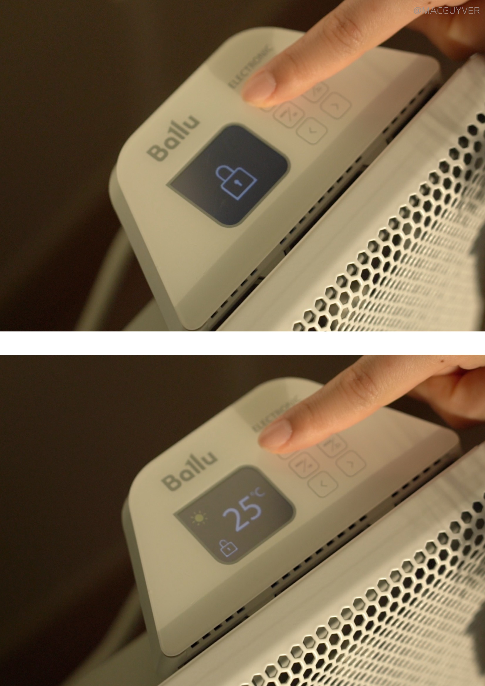 이제 전기컨벡터 남겨진 이야기들을 조금 해볼게요. 터치식 버튼이라 가볍게 눌러주면 컨벡션히터가 조작 됩니다. 오작동을 막아주는 잠금 버튼도 있어서 반려동물이나 아이가 있어도 걱정이 없더라고요. 또 메인 전원은 별도로 물리식 버튼으로 되어서 오작동의 우려도 없었어요. 연속으로 빠르게 터치해 봐도 제대로 반응하고, 버튼음도 들려서 인식률도 좋았는데요. 화면 밝기부터 자동 꺼짐 설정, 버튼음까지 디테일한 설정까지 가능해서 생각보다 조작하기 편하더라고요.