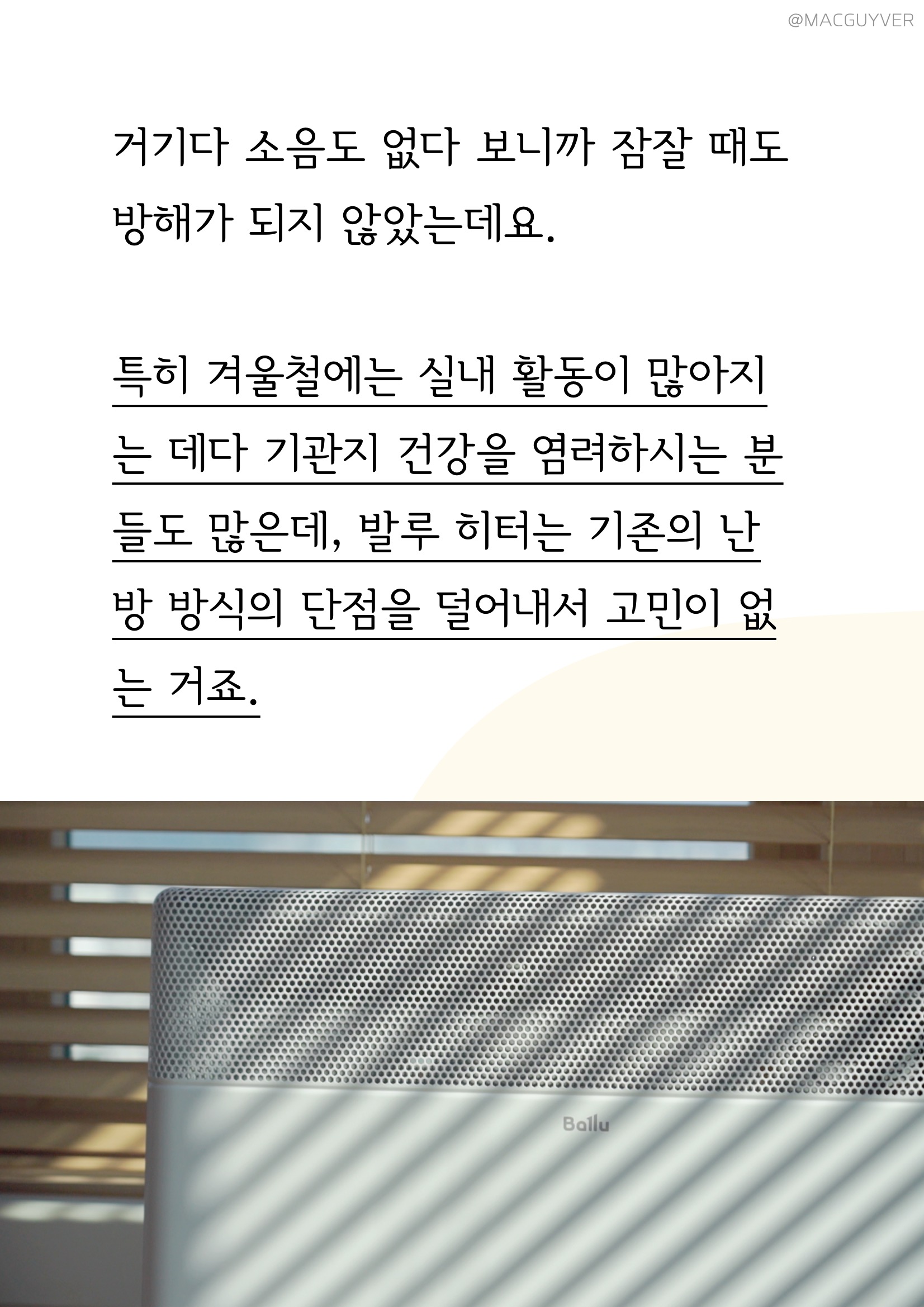 그러면 난방가전으로서의 성능은 어땠을까요? 발루 전기히터 시리즈는 대류식 난방을 활용해서 공기를 태우지 않는 장점이 있는데요. 대류 방식은 따뜻한 공기를 위로, 차가운 공기는 아래로 보내잖아요? 자연스러운 대류 현상을 이용하기 때문에 산소를 태우지 않아서 이산화탄소 발생으로 인한 환기에 대한 걱정도 없고 냄새나 연기에 대한 걱정도 없는 거죠. 거기다 소음도 없다 보니까 잠잘 때도 방해가 되지 않았는데요. 특히 겨울철에는 실내 활동이 많아지는 데다 기관지 건강을 염려하시는 분들도 많은데, 발루 히터는 기존의 난방 방식의 단점을 덜어내서 고민이 없는 거죠.