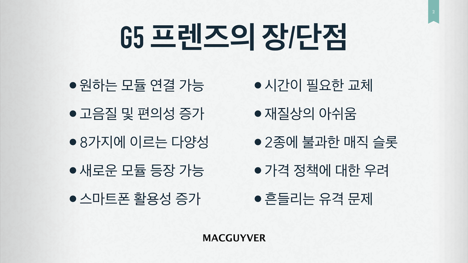 소비자들은 분명 G5와 프렌즈를 실제로 체험해보고자 할 것이고, 여기서 승패가 갈리게 될 것으로 보인다. 스마트폰 자체가 아닌 프렌즈가 가진 매력이 진짜 승부수가 될 G5의 승승장구를 기대해본다. - MACGUYVER.