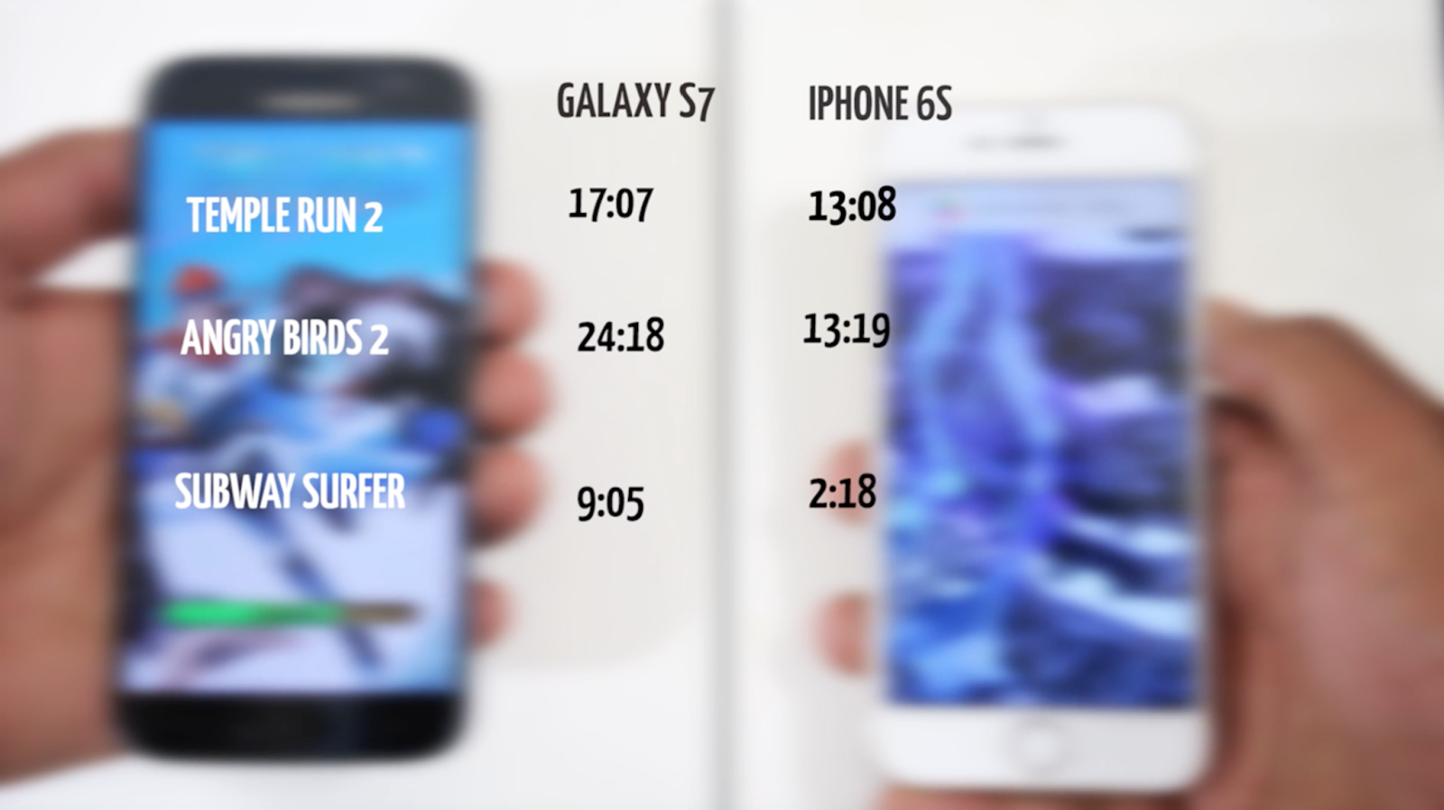 템플런2의 경우 아이폰6s는 13초 정도가 소요되었지만, 갤럭시S7은 17초가 소요되었다. 앵그리 버드 2의 경우도 아이폰6s는 13초 정도가 걸렸지만, 갤럭시S7은 24초가 넘게 걸렸다.