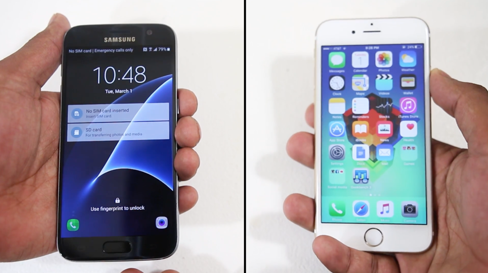 부팅 속도에 있어서는 19초 만에 부팅이 끝난 아이폰6s의 승리였다. 반면 갤럭시S7은 제법 빨라진 부팅이라고는 하지만 28초가 걸리는 모습을 보여줬다. 1:1로 비교하자면 아이폰의 승리인 셈.