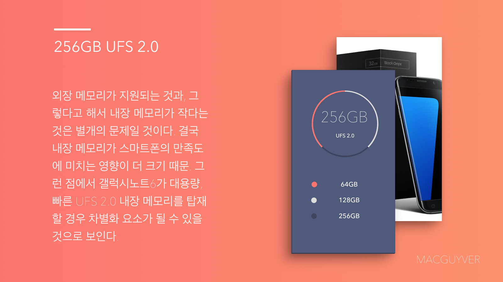 외장 메모리를 지원하지만 UFS 2.0 내장 메모리는 SD 카드 대비 9배 정도 더 빠르기 때문에 속도나 안정성에서 비교가 되지 않는다. 그런 점에서 지난해 겨울, 뒤늦게 갤럭시노트5가 128기가 모델을 내놓은 것이 떠오르기도 한다.