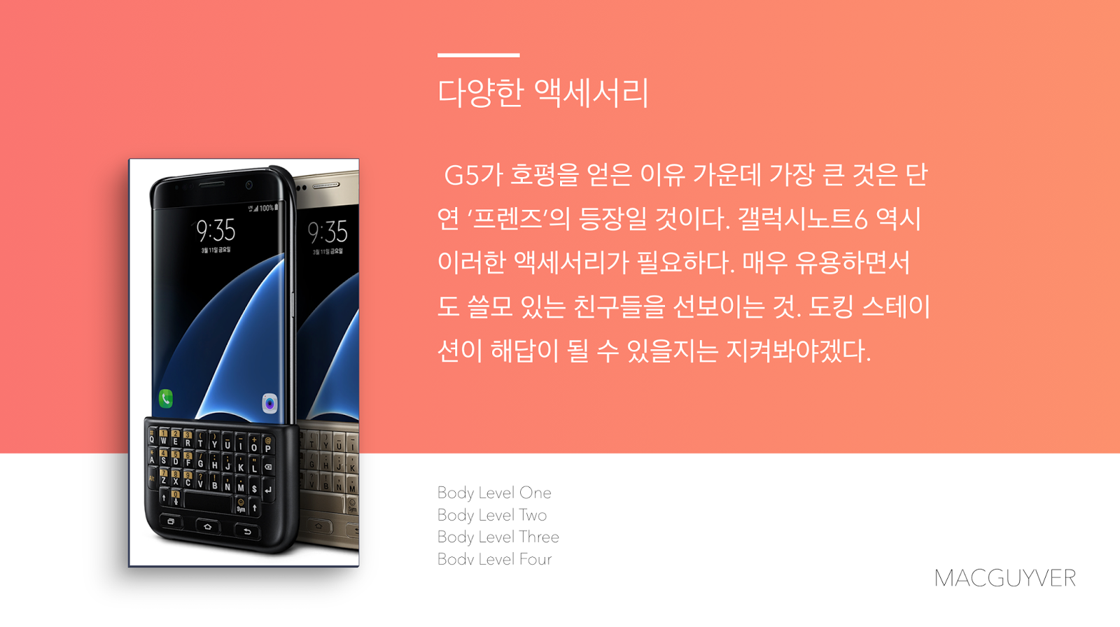 소비자들이 기존의 폰을 팔아버리고 갤럭시노트6를 구매할 정도의 매력을 품기 위해서 더욱 부단한 노력이 필요한 것이다. 전작을 뛰어넘는 것에 그치는 것이 아닌, 새로운 혁신을 보여줄 갤럭시노트6를 기대해봐야겠다. - MACGUYVER.