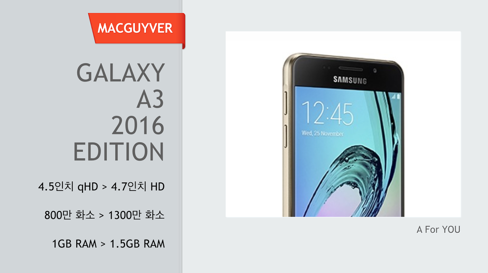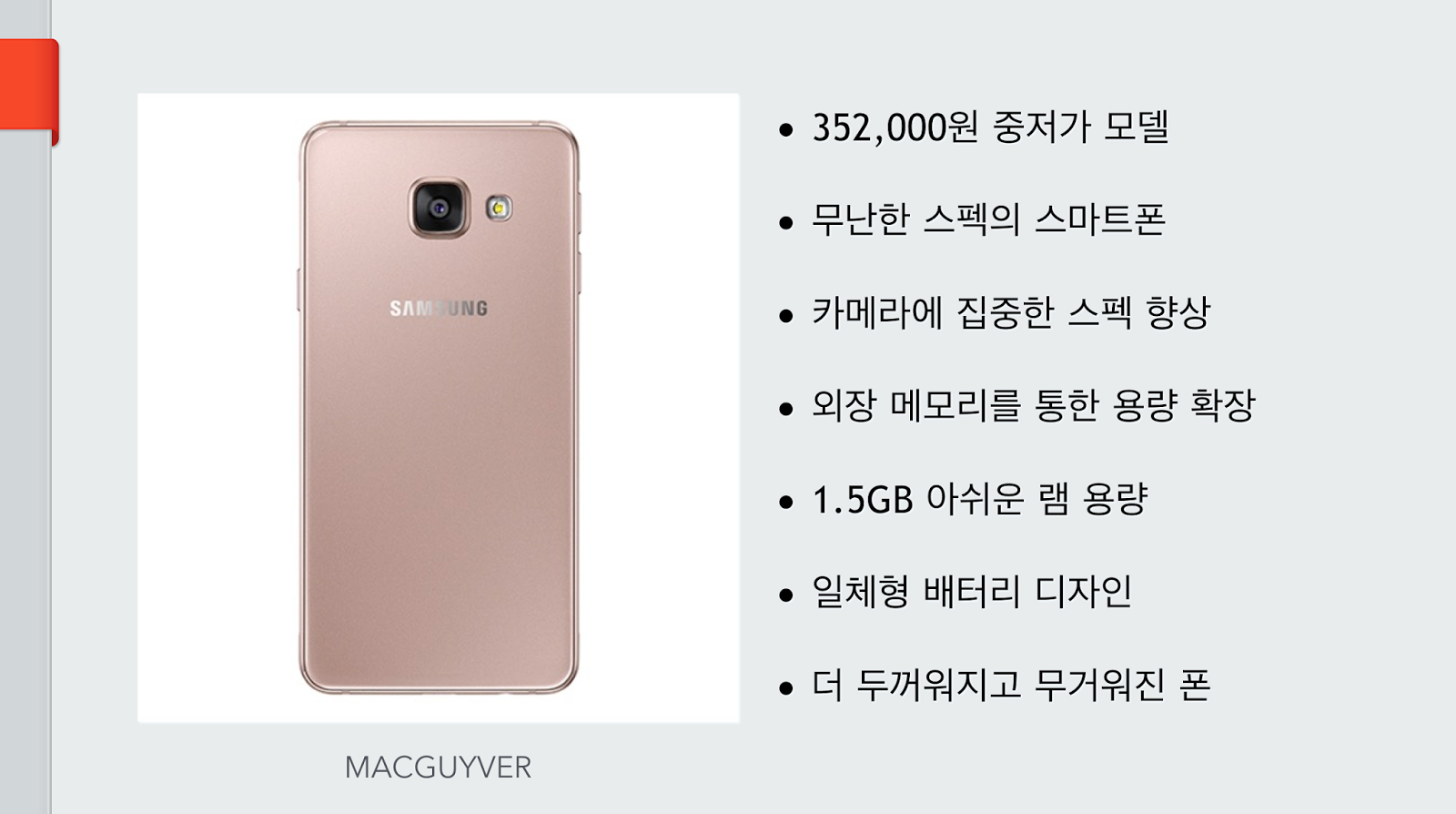 갤럭시 A3가 스펙이 높은 것은 아니지만, 모든 사람이 최고 사양의 폰이 필요한 것도 아니라는 점을 고려하자면, 작은 폰으로 부담 없이 사용하고 싶은 분들, 그러면서도 사진 찍기를 즐기는 분들에게 알맞은 폰이 될 것 같다. - MACGUYVER.