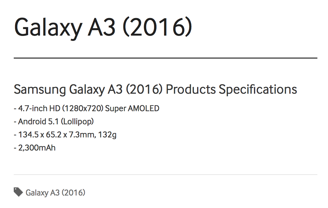 하지만 아쉬움이 없지는 않다. 갤럭시 A 시리즈 가운데 가장 저렴한 모델이라는 아킬레스건으로 인해서 다른 갤럭시 A 2016 에디션 시리즈에는 새롭게 추가된 지문인식과 삼성 페이가 모두 제외되었다.