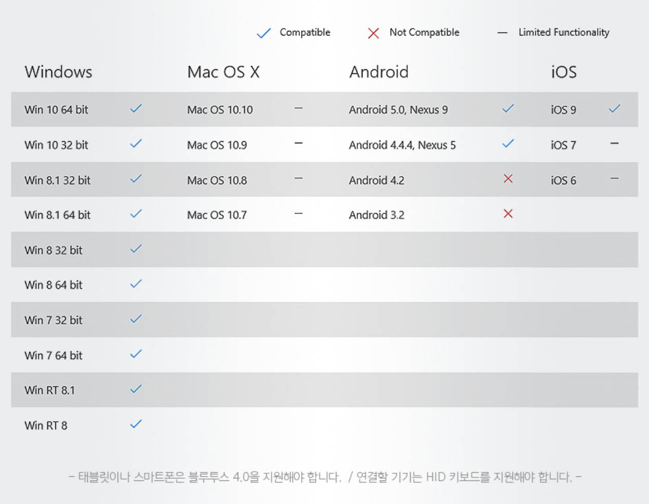 더구나 개방성의 윈도우와 마찬가지로 MS와 구글, 애플의 운영체제를 모두 지원하며 페어링 시에, 혹은 설정으로 각 운영체제에 맞는 핫 키를 바로 지원한다는 점도 빼놓을 수 없는 장점이다.