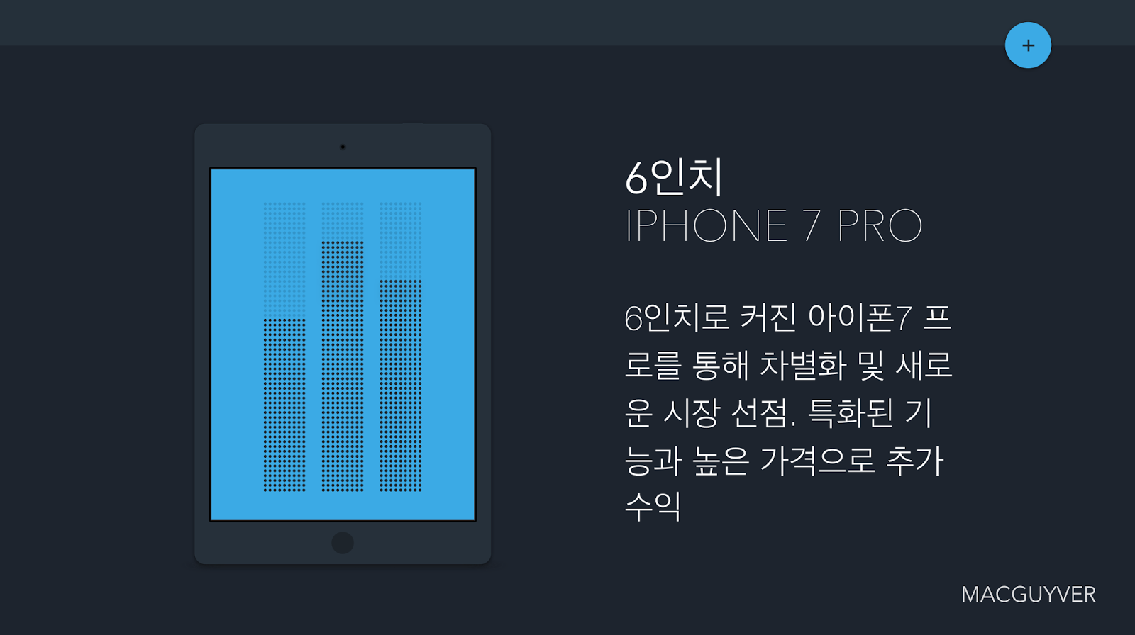 6인치로 커진 아이폰7 프로는 높은 가격 장벽과 함께 큰 사이즈로 인해 한정적인 시장이 될지는 몰라도 프리미엄이라는 이미지에 걸맞는 제품이 될 수 있을 것으로 보인다.