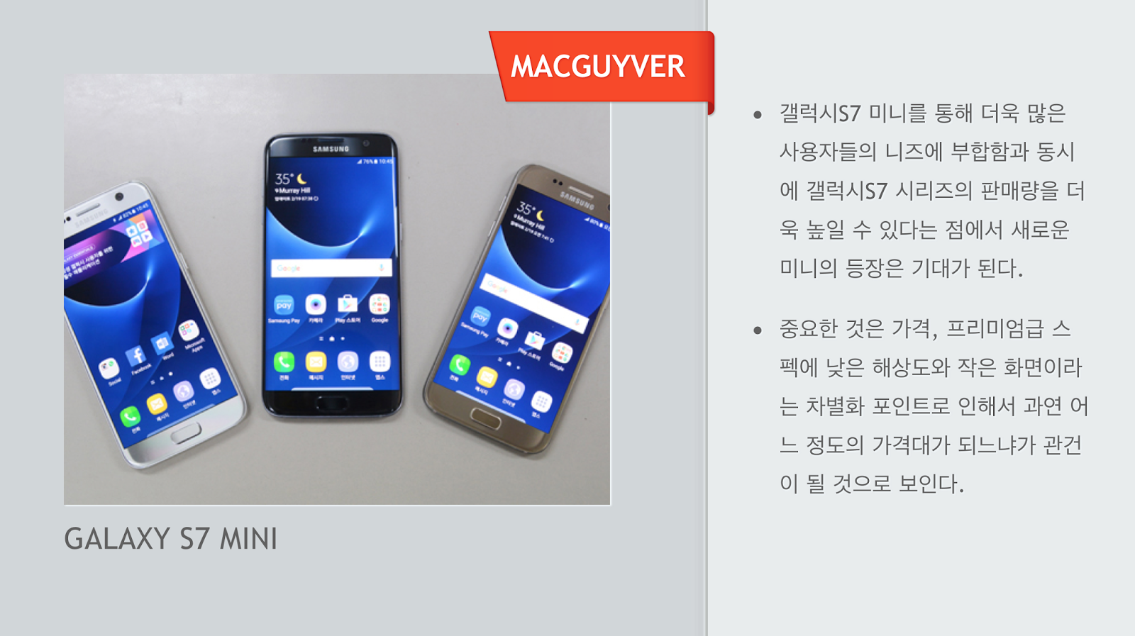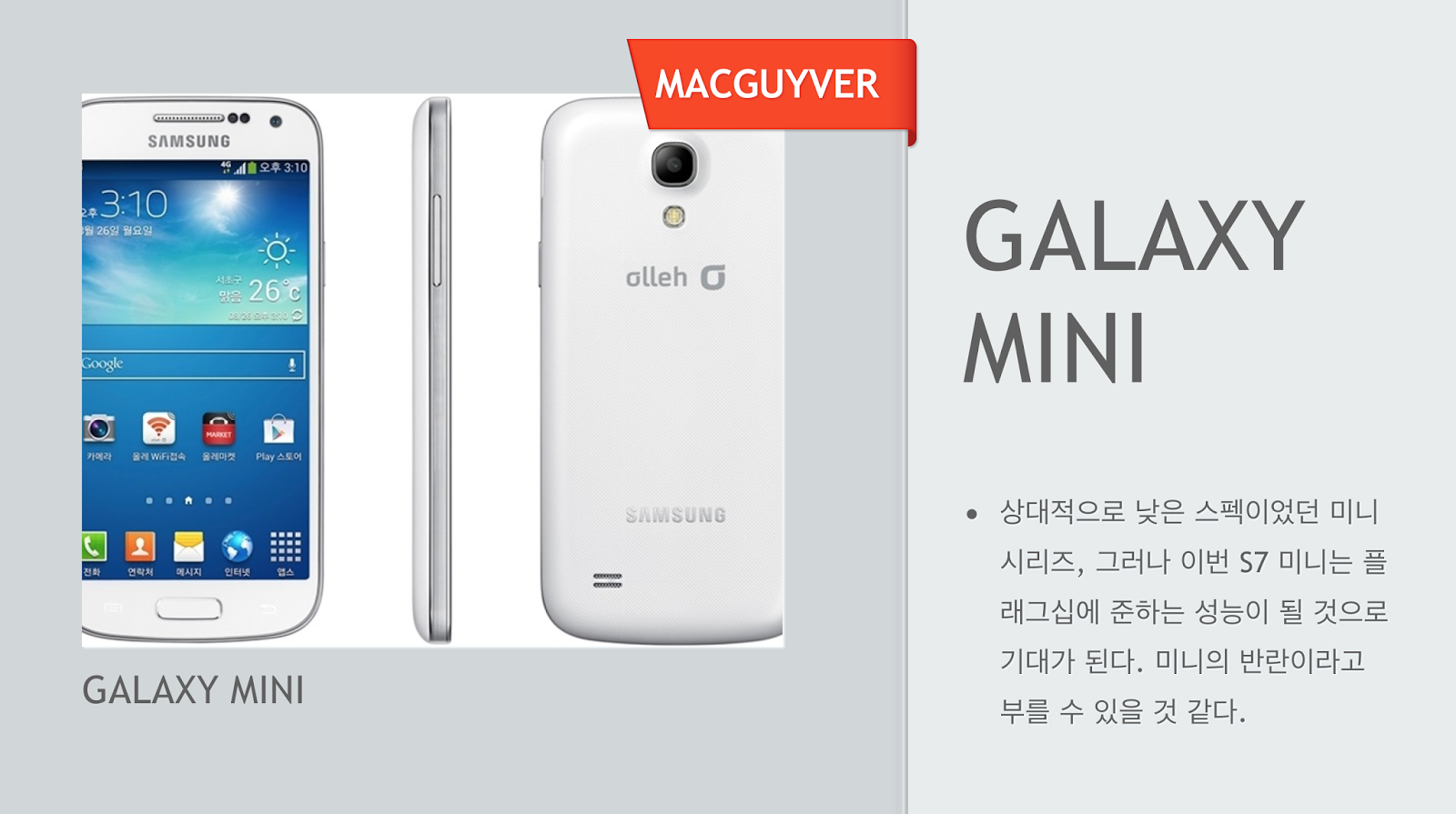 새롭게 선보인 갤럭시S7을 통해 프리미엄 시장에서 삼성의 위치를 재확인하고, 갤럭시S7 미니를 통해 더욱 많은 소비군들을 끌어들이려는 전략. 애플이 다시금 4인치 아이폰을 내놓는 전략과 비슷해 보인다. - MACGUYVER.