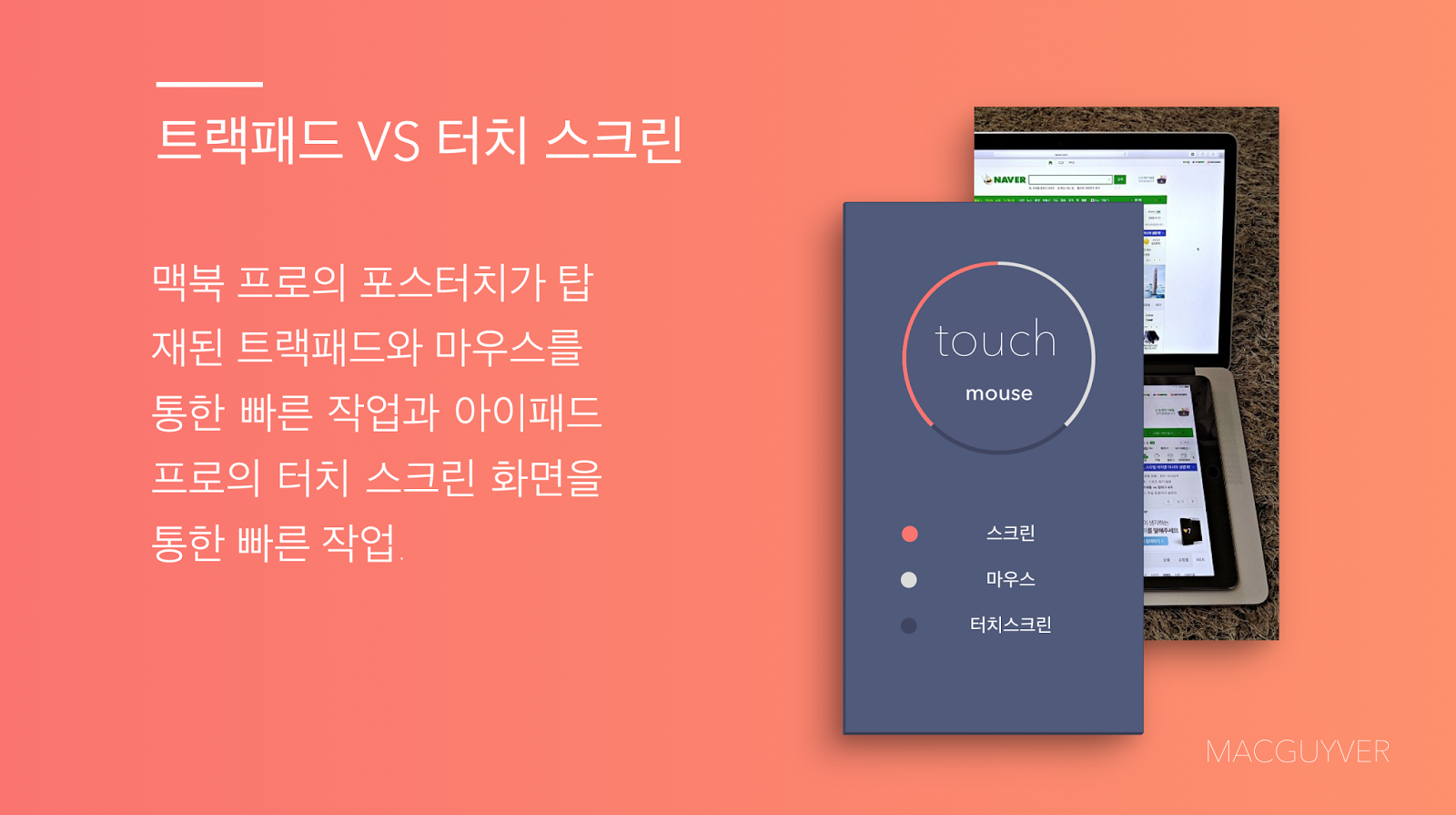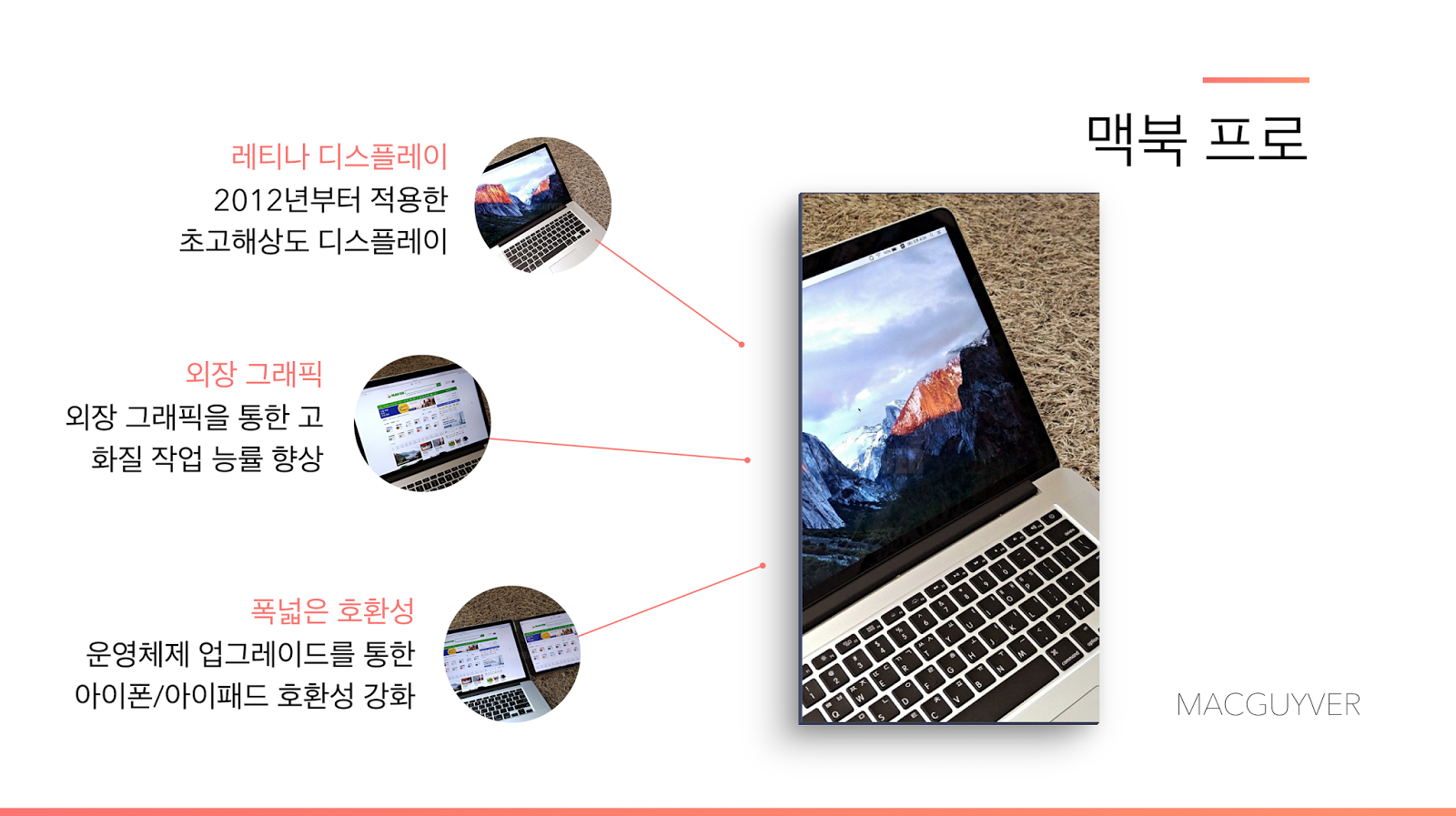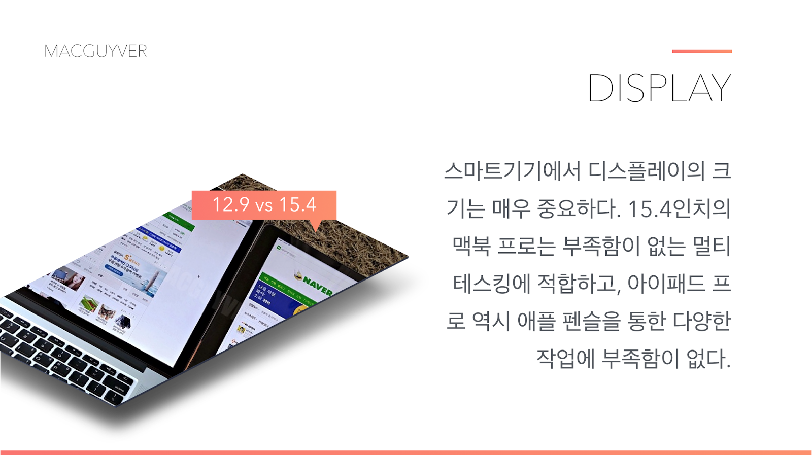서로 다른 ‘프로’가 가진 아이덴티티와 서로의 장단점을 비교하며 아이패드 프로와 맥북 프로 15형 모델 가운데 저울질을 하는 분들을 위해 작성된 포스트라 볼 수 있다. 정답은 없겠지만 자신에게 맞는 훌륭한 대안을 찾기 바란다. - MACGUYVER.