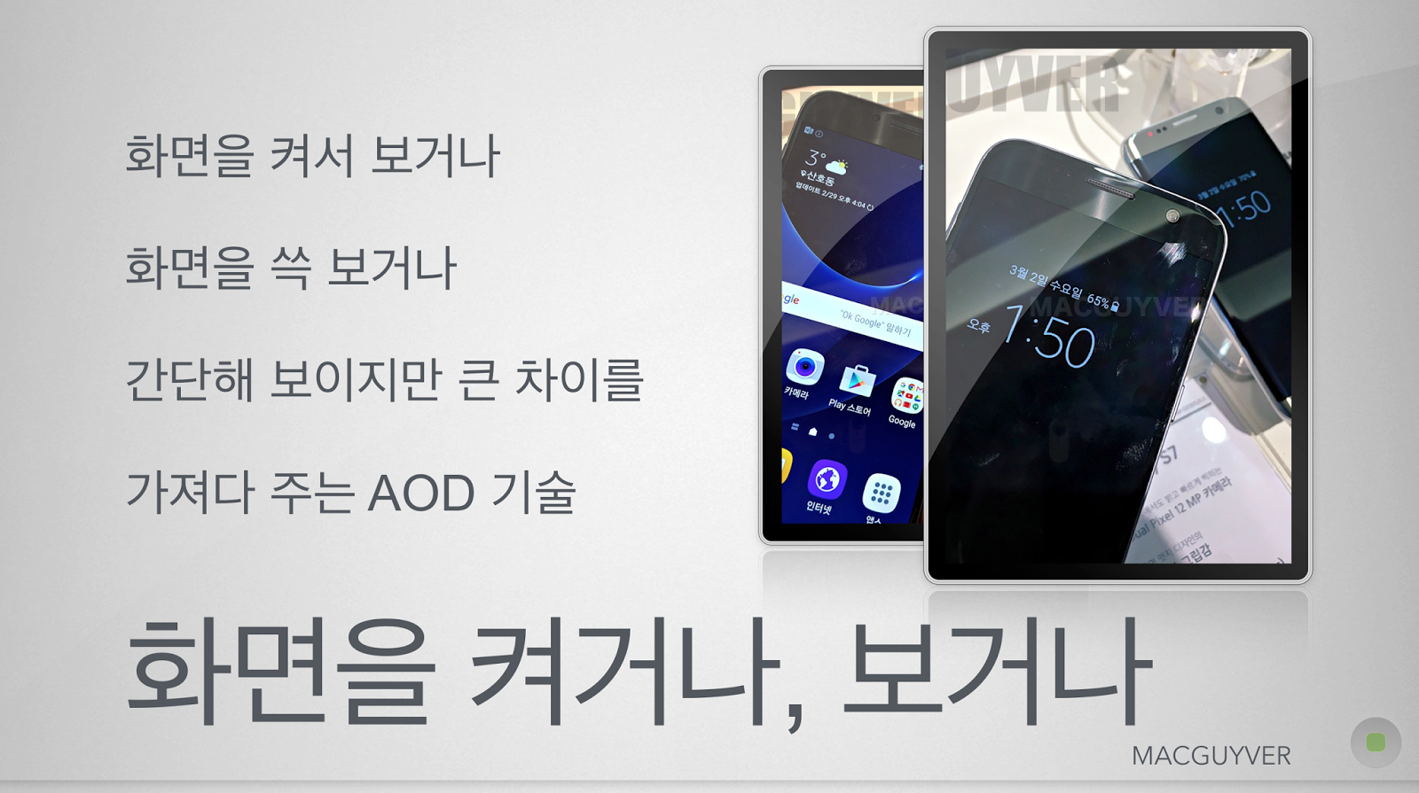삼성의 갤럭시S7과 엘지의 G5는 모두 올웨이즈 온 디스플레이를 탑재했다. 수많은 스마트폰 제조사 가운데 이처럼 실생활에 유용하고 편리한 기술을 적용한 두 업체의 선방을 기대해봐야겠다. - MACGUYVER.