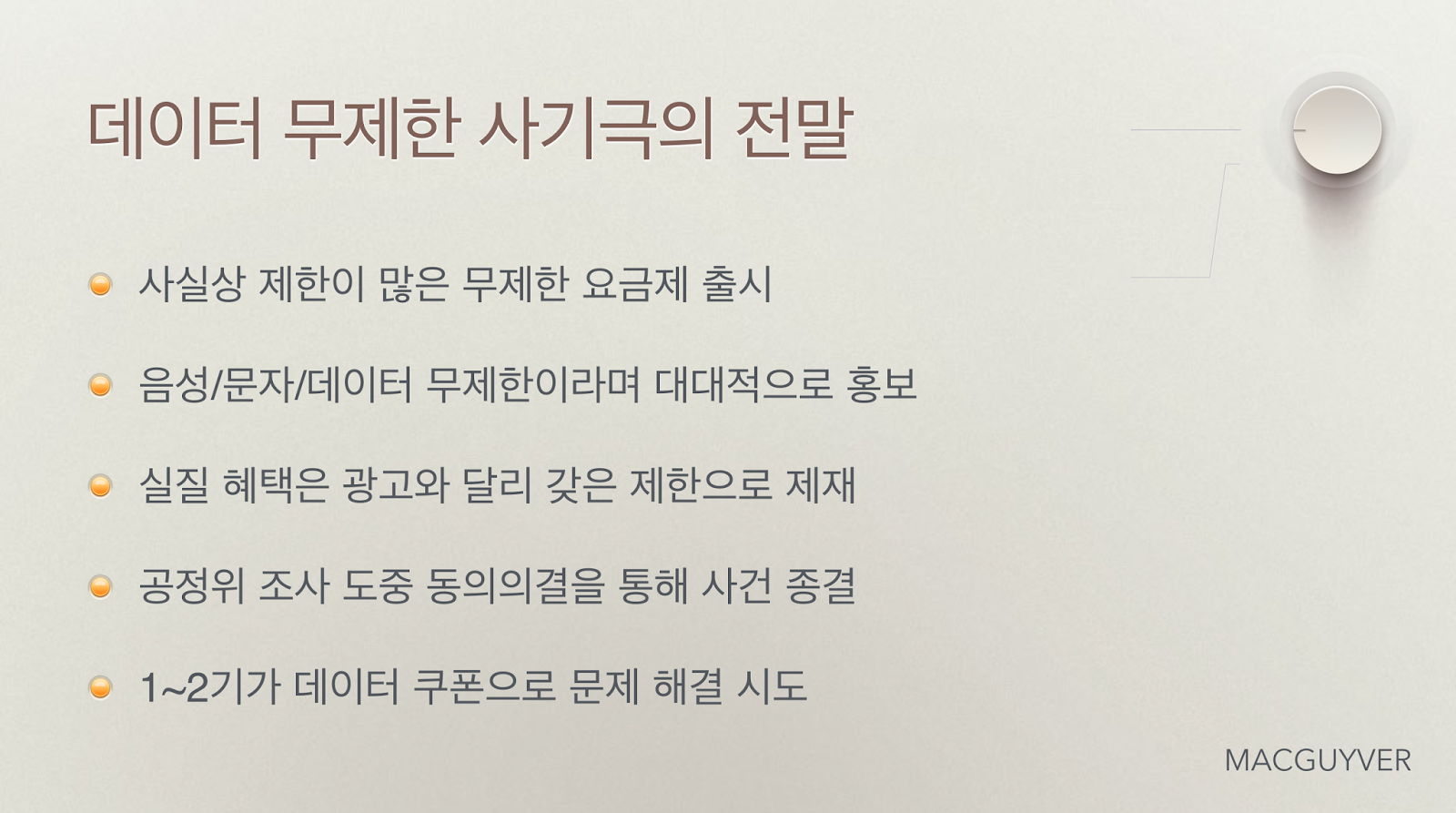 사용자에 따라서 사용 패턴이 다르며, 그에 따라서 최적화된 요금제를 선택할 권리를 주는 것이 올바른 통신 시장의 발전 방향일 것이다. ‘5G를 향하여’라는 거창한 문구 대신, ‘소비자를 향하여’라는 보다 인간적인 마인드를 기대하는 것은 지나친 욕심일지도 모르겠다. - MACGUYVER.