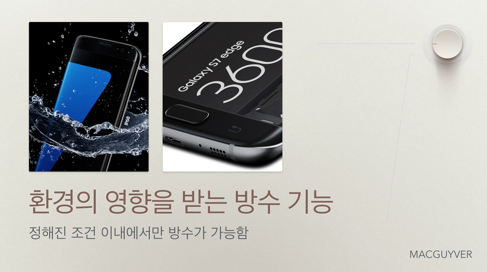 갤럭시S7이 캡리스 방수를 통해 편의성을 한층 더 끌어올렸고 이로 인해서 소비자들은 갤럭시S7에 대해 많은 관심을 가지고 있다. 그러나 늘 호기심이 문제다. 하지만 갤럭시S7의 방수 기능에 대해서만큼은 호기심을 접어두는 것은 어떨까 한다. - MACGUYVER.