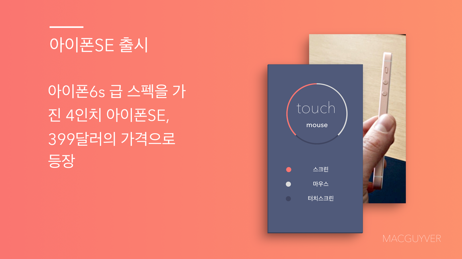 시장이 변하고 있다. 고가의 프리미엄만을 유지하던 애플이 겨우 399달러에 아이폰6s급의 스펙을 가진 4인치 아이폰을 내놓은 것이다. 이것만으로 중고 시장뿐 아닌, 다른 통신 시장 자체가 흔들리고 있는 상황이다. 과연 시장이 어떻게 변하게 될지 지켜봐야겠다. - MACGUYVER.