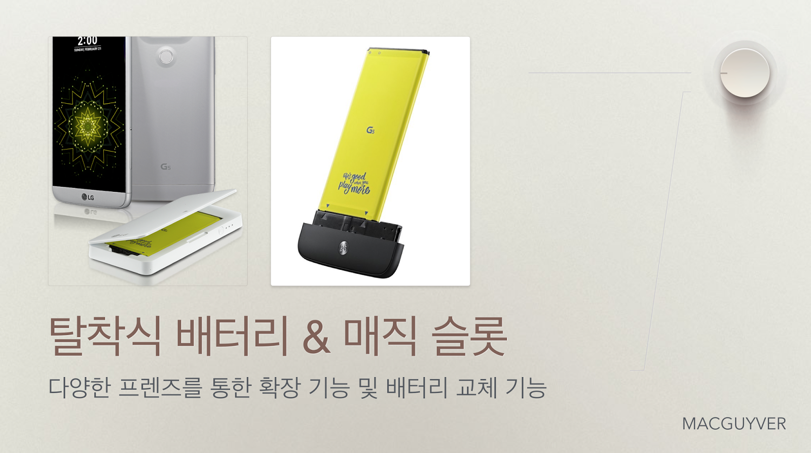 만일 엘지전자가 G5의 모듈만 별도로 분리가 되도록 하고, 배터리는 가볍게 누르면 살짝 튀어나와서 별도로 교체를 할 수 있도록 만들었거나, 혹은 배터리와 함께 분리가 되더라도 일부 네티즌들의 이야기처럼 1분 정도 전력이 유지되도록 했다면 더 편리하지 않았을까 한다.