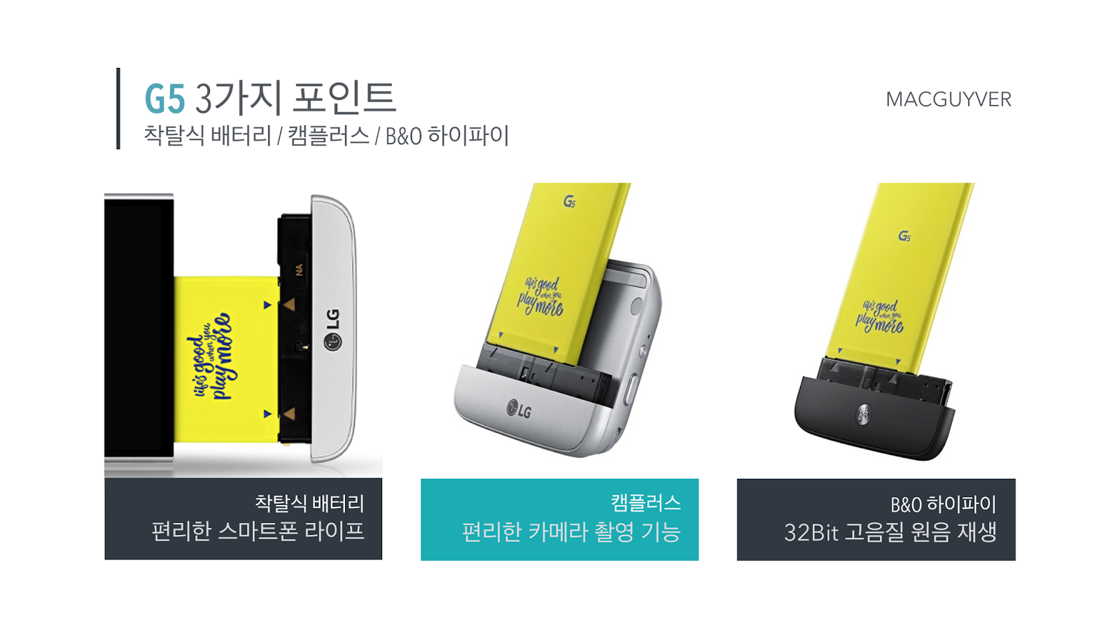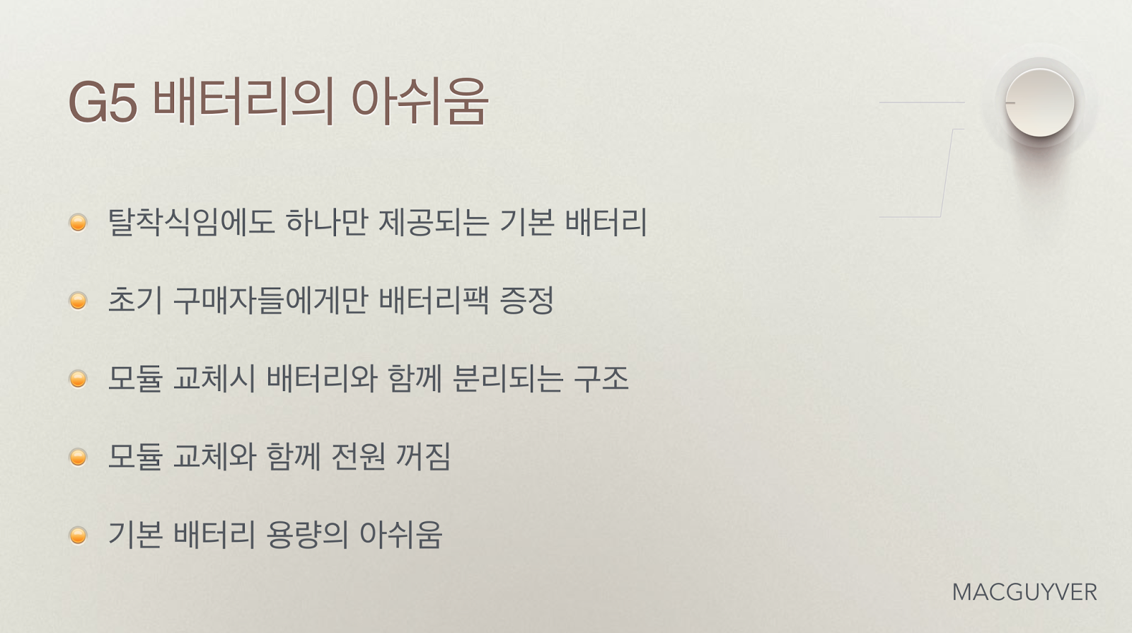 이번 G5 역시 새로운 시도를 했다는 점에서, 그리고 소비자들이 원하는 탈착식 배터리를 유지했다는 점에서는 높은 점수를 주고 싶다. 하지만 배터리가 탈착식이라는 큰 장점을 소소한 아쉬움들로 인해서 반감시키는 것은 분명 개선되어야 할 것 같다.