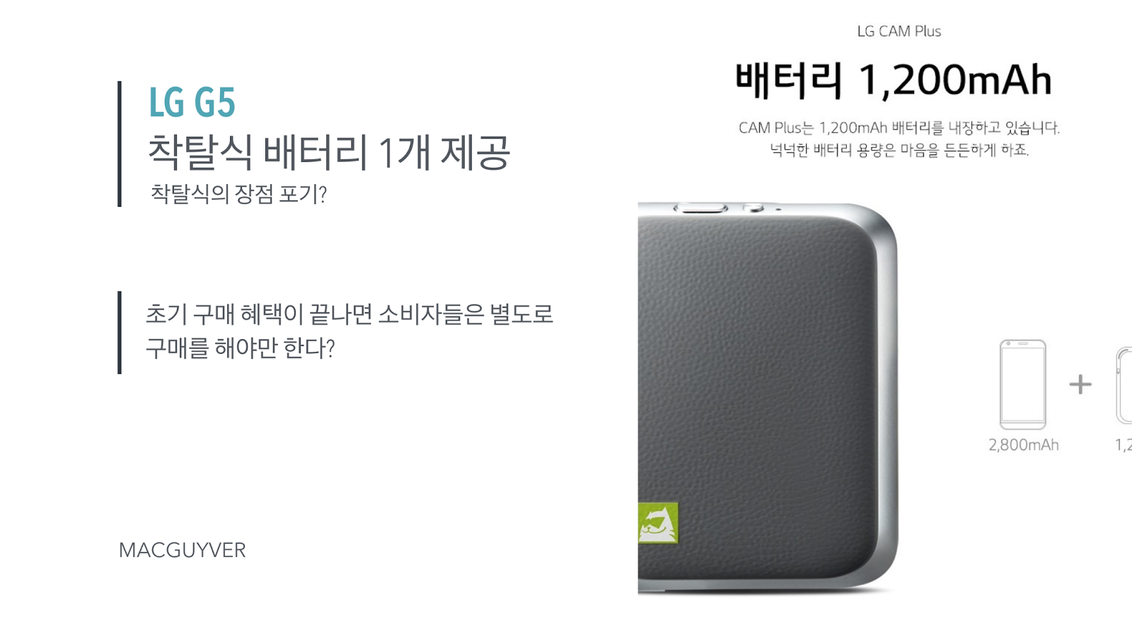여기에 마케팅 비용과 개발 비용, 마진 등을 제외하고 또한 통신사 수익까지 고려한 최종 금액이 출고가가 되는데, 일반적으로 2~30만원 수준인 제조 원가를 고려하자면 80만원 초반대로 알려진 G5가 배터리를 하나만 제공하는 것은 의문이 들 수밖에 없다.