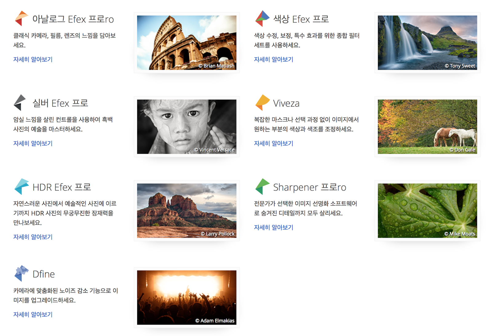 해당 프로그램 안에서 활용할 수 있는 플러그인이라고 볼 수 있는데, Nik의 기능은 단순히 필터를 입혀서 독특한 색감을 전달하는 차원을 넘어선다. 보다 고급 기술을 제공하는데, 아날로그 효과를 비롯해 색상을 복원하거나 원하는 부분에만 색상을 보정할 수도 있다.