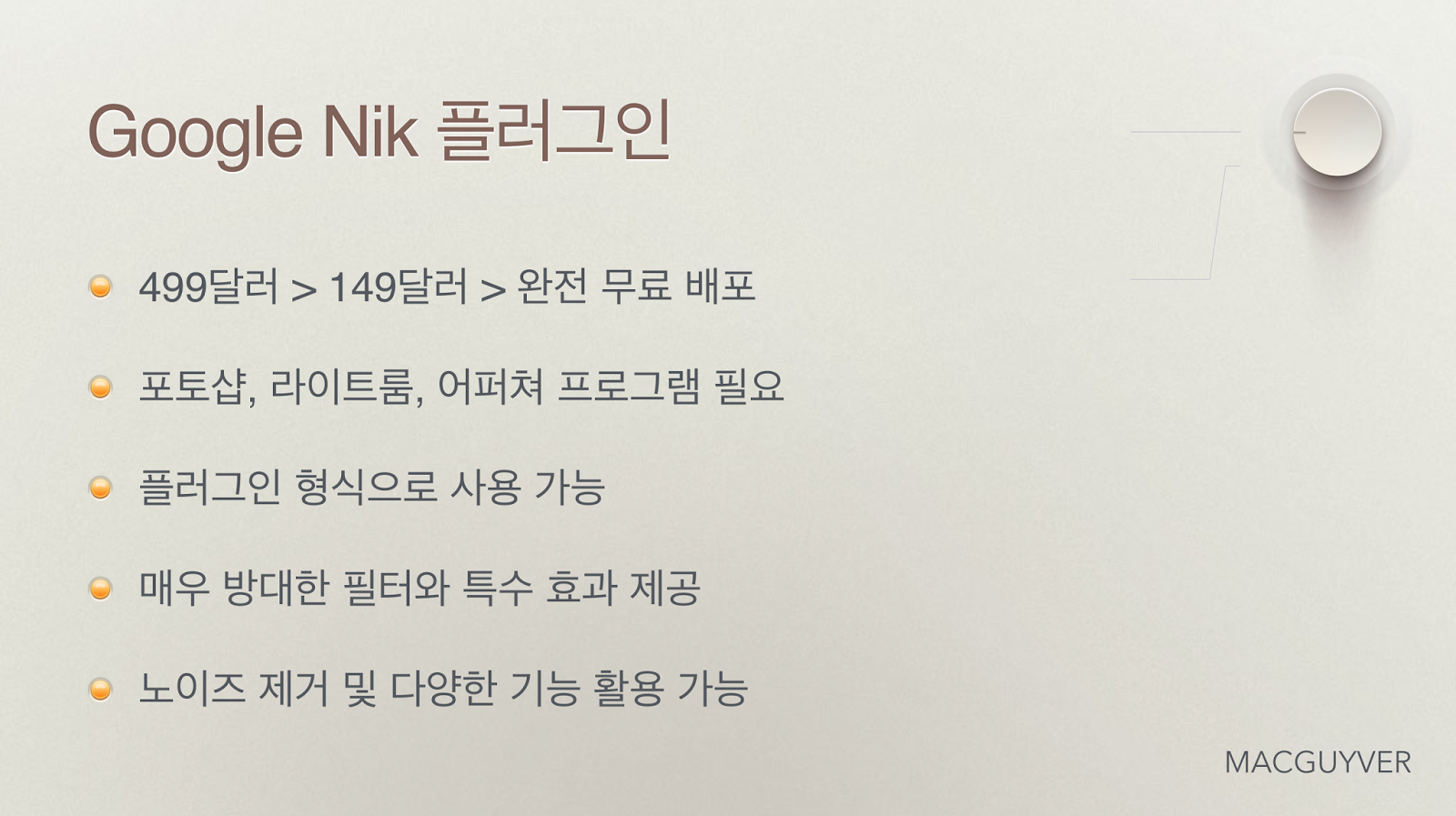 아무튼, 이번에 구글이 통 크게 무료 배포를 선언한 Nik을 통해서 구글이 그리는 미래가 조금은 더 명확해지는 것 같다. 조금 더 소비자 친화적인 구글의 이러한 무료 서비스 전략. 이러한 달콤한 전략이라면 앞으로도 얼마든지 환영이다. - MACGUYVER.