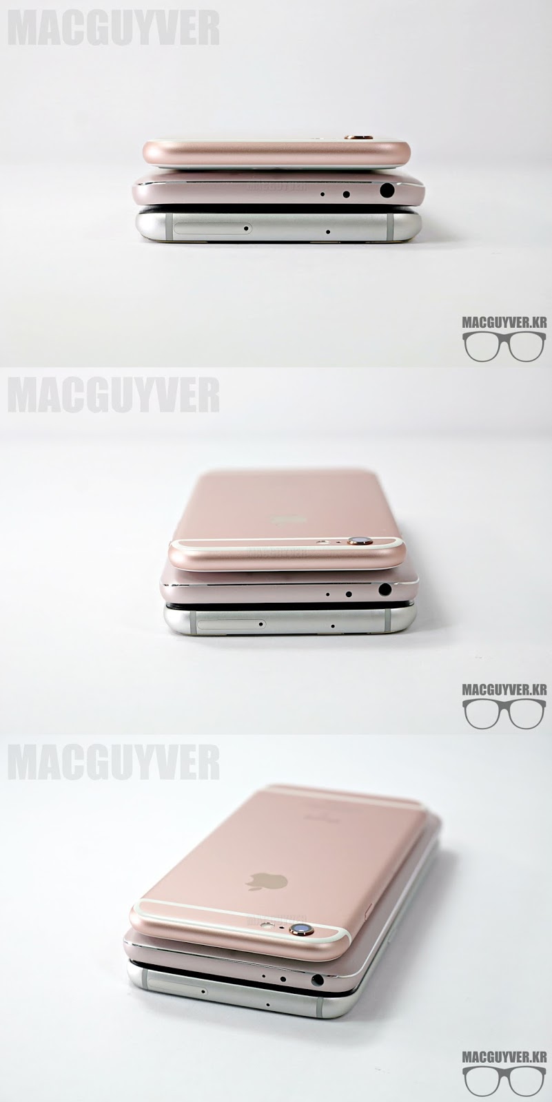 로즈 골드 컬러의 아이폰6s가 가장 짙은 색을 가지고 있고, G5는 다소 밝은 핑크를, 갤럭시S7은 필름을 부착해서 흐릿한 실버가 되었다 ▼