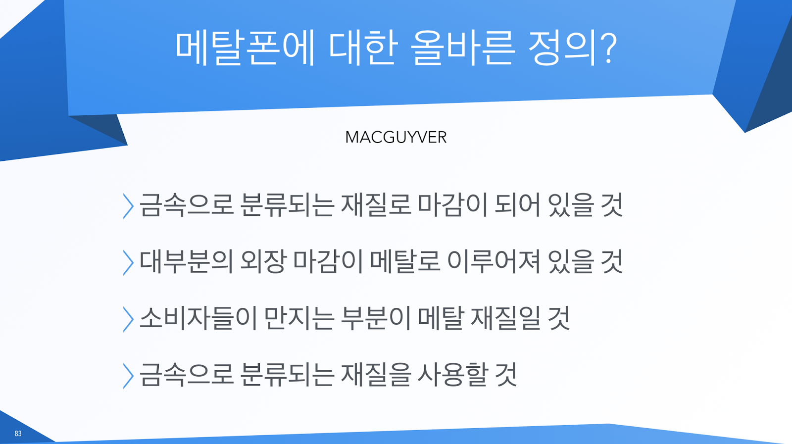 그런 점에서, 소비자들이 이해하고 받아들이는 것은 내가 만지는 곳이 대부분 메탈 재질로 되어 있을 경우 그것을 메탈폰으로 부른다는 것이다. 그러나 메탈이 사용되었다고 하더라도 결국 외부 마감이 다른 재질로 되어 있다면 그것을 메탈폰으로 부르기는 난감할 것 같다.
