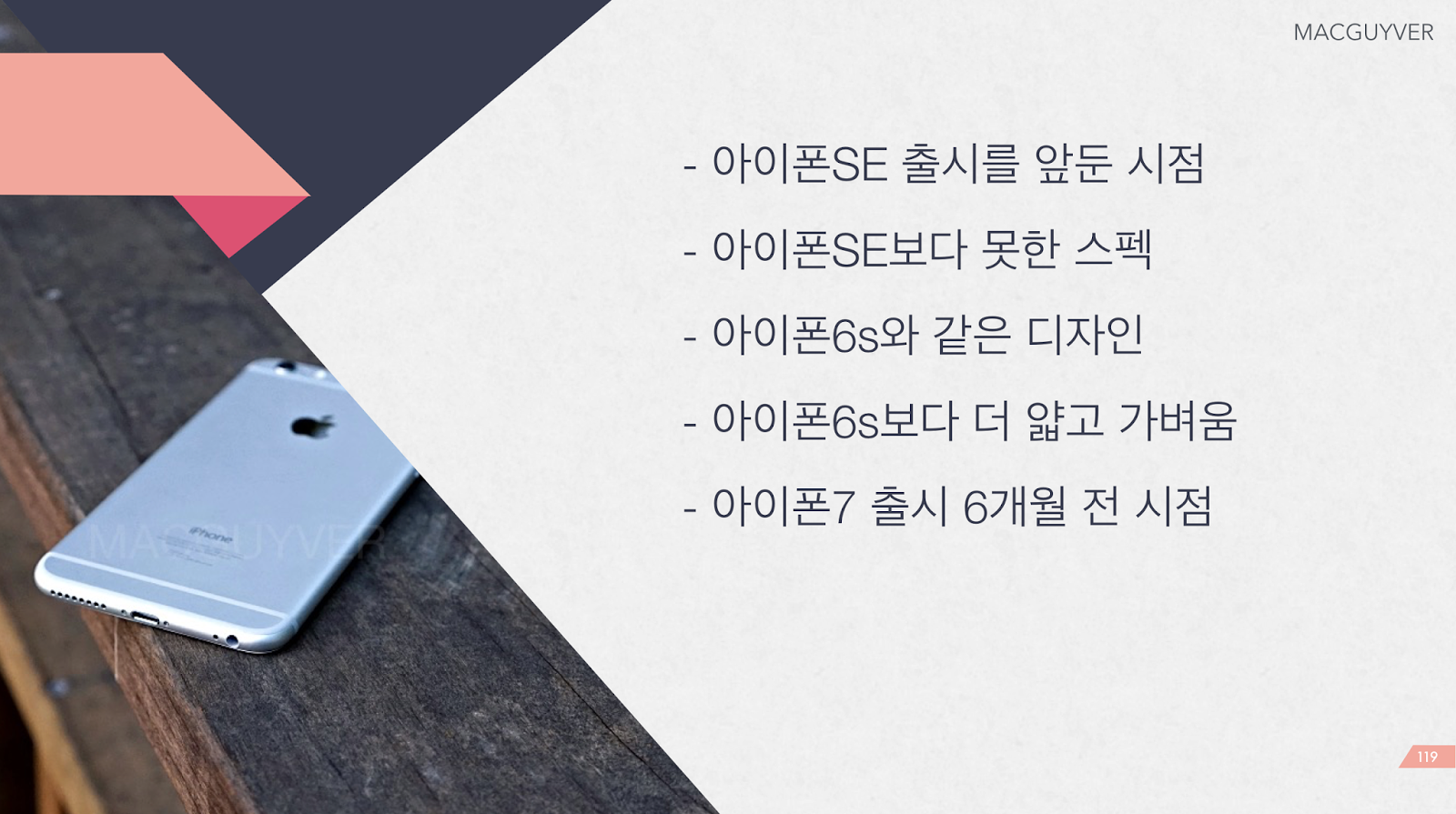 출시된 지 2년이 채 되지 않은 아이폰6, 여전히 아이폰6에 대한 인기와 관심이 높은 가운데, 4월 말에 국내 출시 예정인 아이폰SE와 저울질을 하고 있다면, 조금 더 살펴보고 선택을 해보는 것도 나쁜 선택은 아닐 것 같다. - MACGUYVER.
