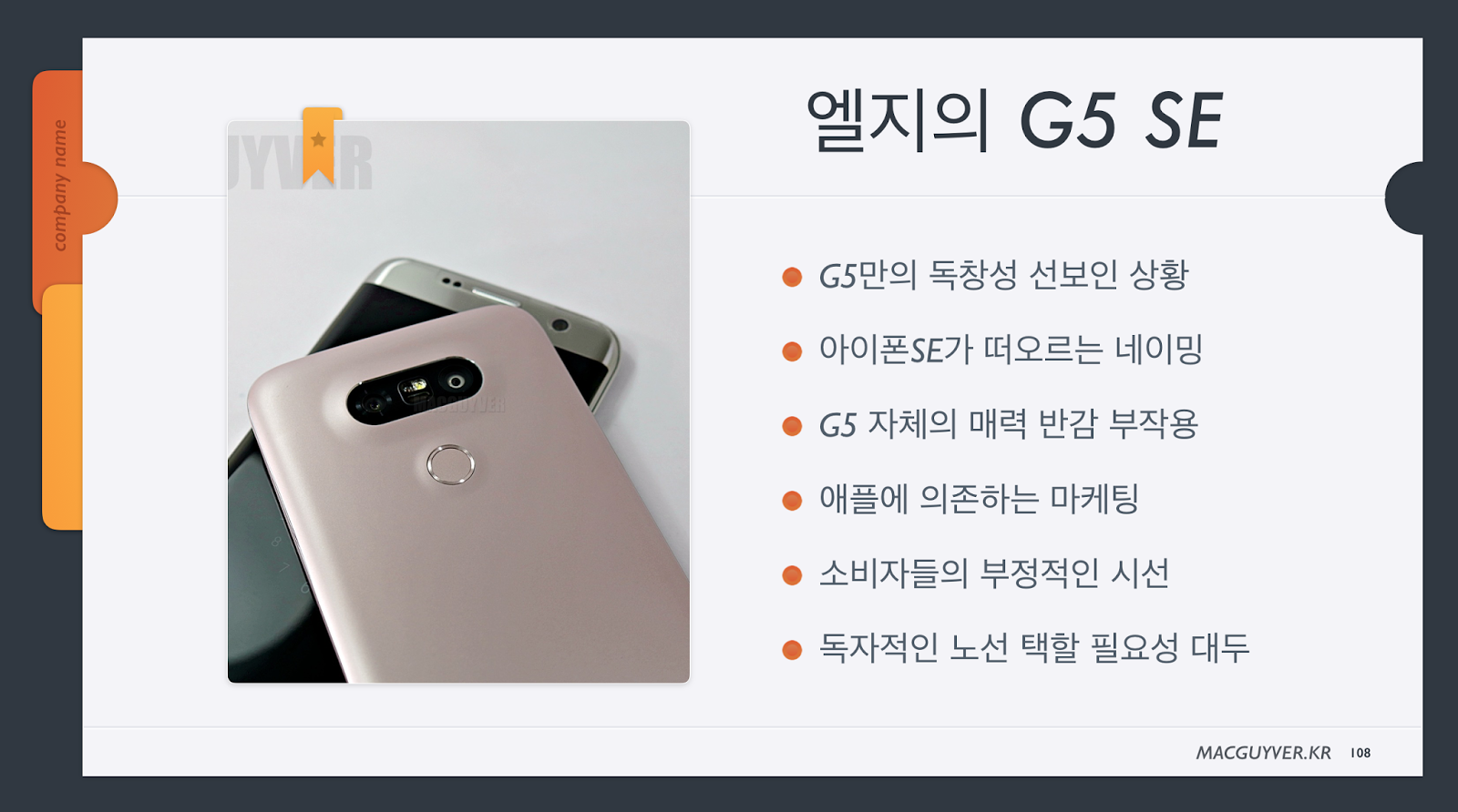 엘지 역시 어떤 이유로든, 아이폰SE가 공개되기도 전에 정해진 네이밍이었든 아니든, G5만의 색을 유지하고 아이폰에서 벗어나려는 선택을 하는 편이 더 좋았을 것이다.