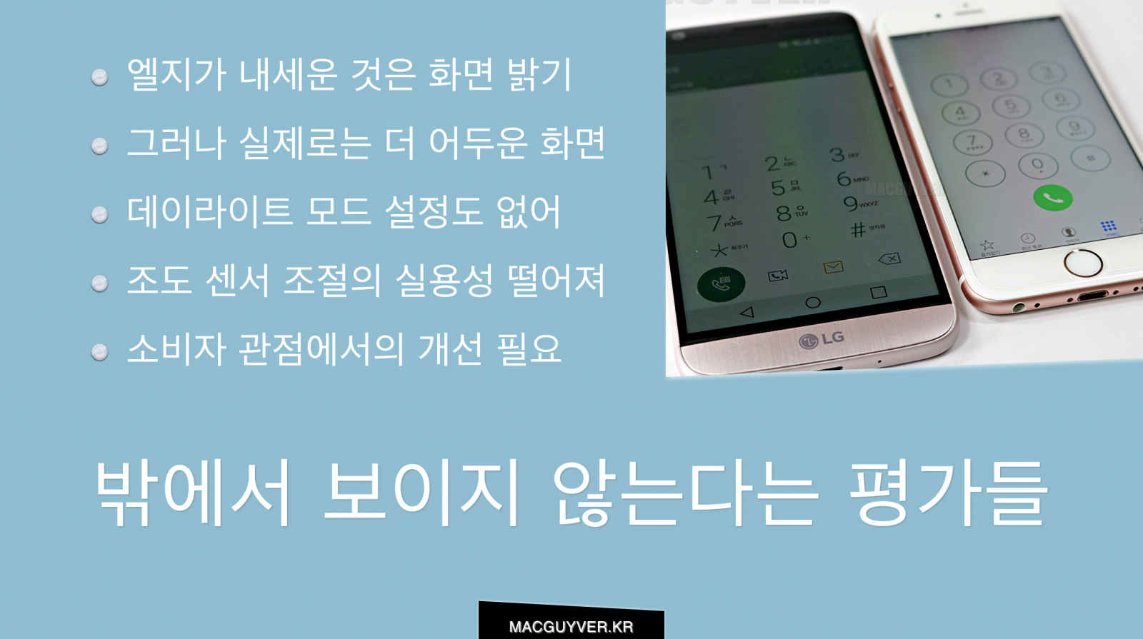 모든 스마트폰은 기술의 한계 아래 위치하고 있다. 그것을 넘어서는 것은 시대를 넘어선 기술로 평가가 되지만 동시에 다른 아킬레스건을 가지게 된다. 화면 밝기를 내세운 G5가 이러한 기술 장벽을 극복하는 모습을 보여주기를 기대해본다. - MACGUYVER.