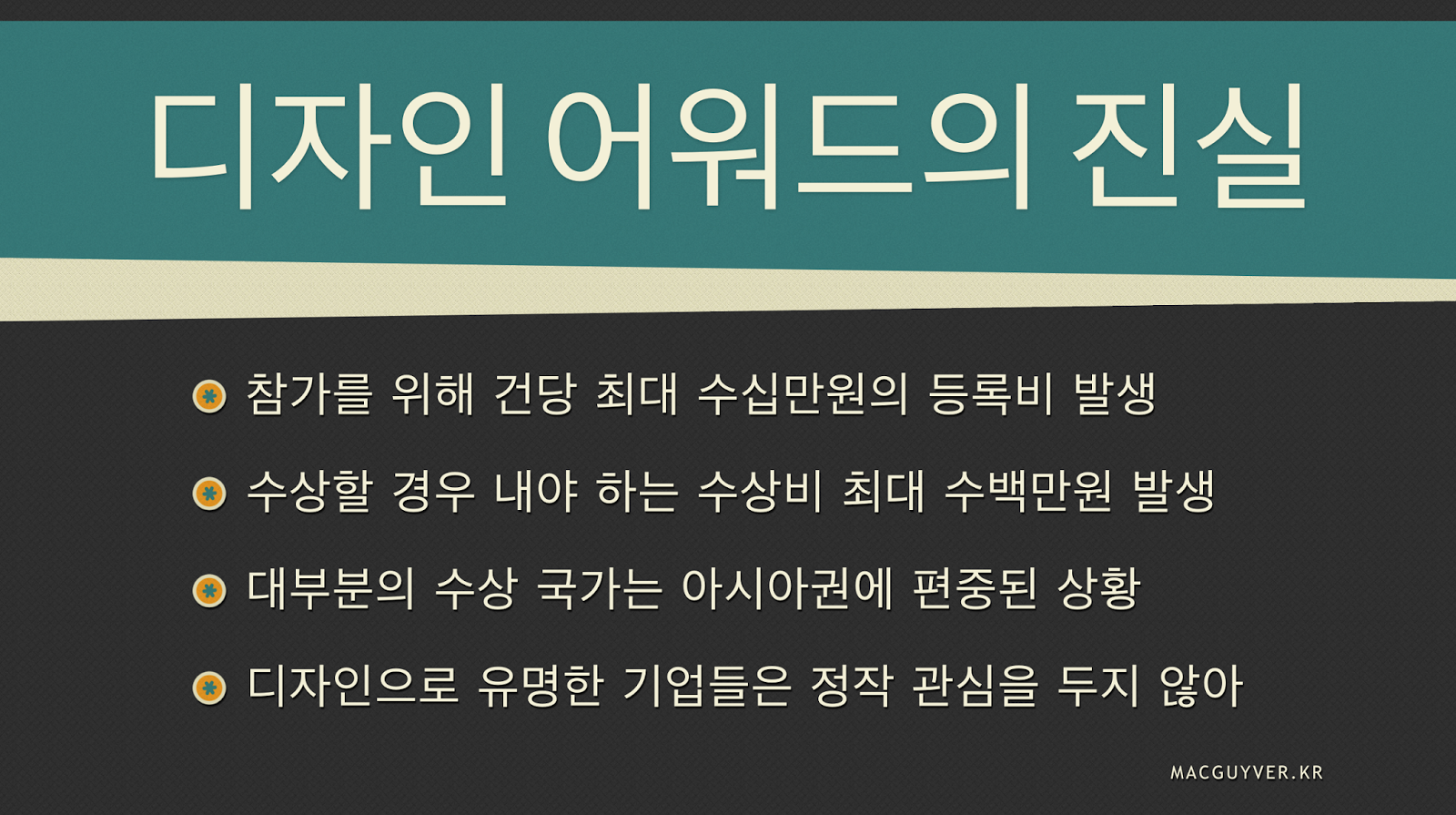 물론, 전문적인 기관을 통해 받는 상이라면 그것 자체에는 문제가 없을지 몰라도, 디자인상을 받기 위해 등록하는데 별도의 비용이 발생하고, 심지어 수상하게 되면 수상비를 별도로 내야 한다면 어떠할까?