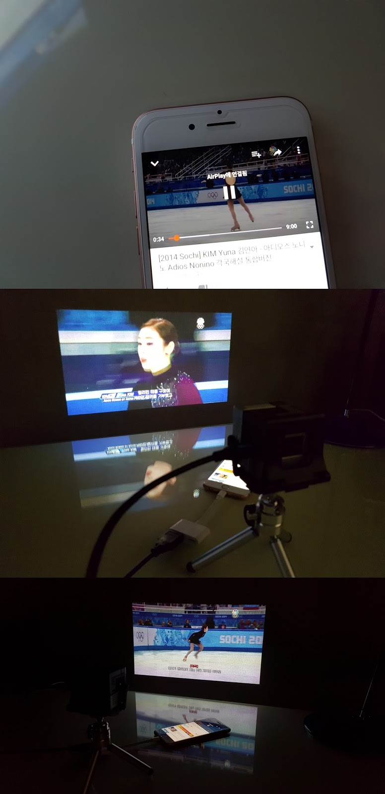 하지만 역시나 미니빔의 한계로 인해 조명이 강할 때는 잘 보이지 않는 화면 ▼