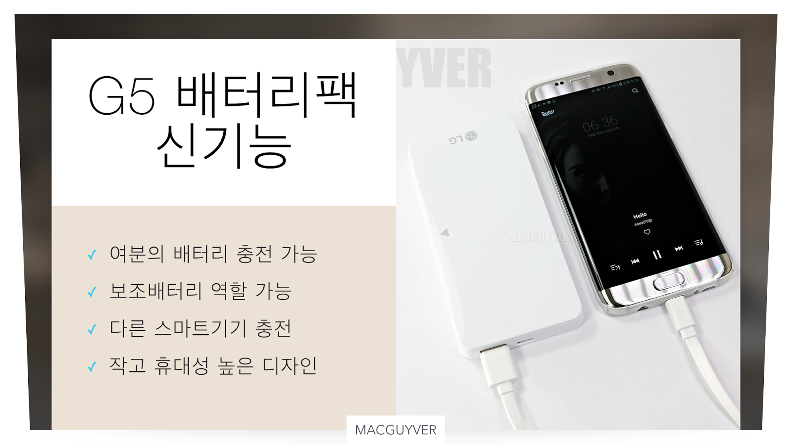그러니까, G5의 배터리가 부족할 때면 어김없이 G5를 위한 배터리가 되어주지만, 굳이 교체가 필요치 않고 다른 기기의 배터리가 부족할 경우에는 보조배터리로도 활용할 수 있기 때문에 활용도가 더욱 커지는 것이다.