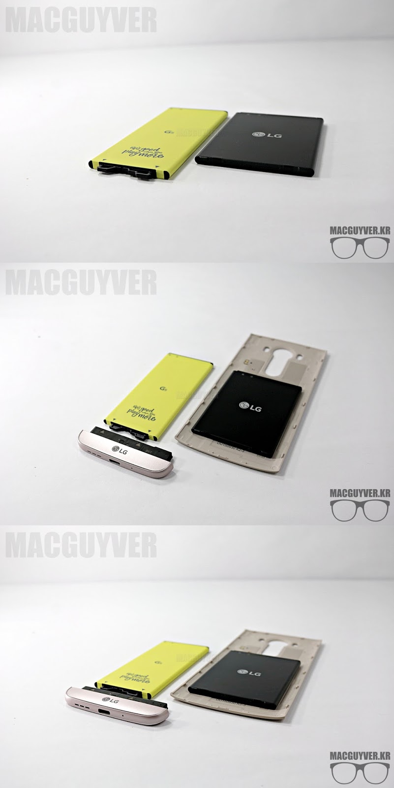 G5는 일체감 있는 유니바디 디자인을 선보이면서도 탈착식 배터리를 유지하기 위해서 갖가지 아이디어를 만들어 냈는데, 그 결과물은 심히 놀라웠다. 단순히 배터리를 슬라이드 해서 빼는 것만이 아닌, 이것을 모듈 방식으로 만든 것.