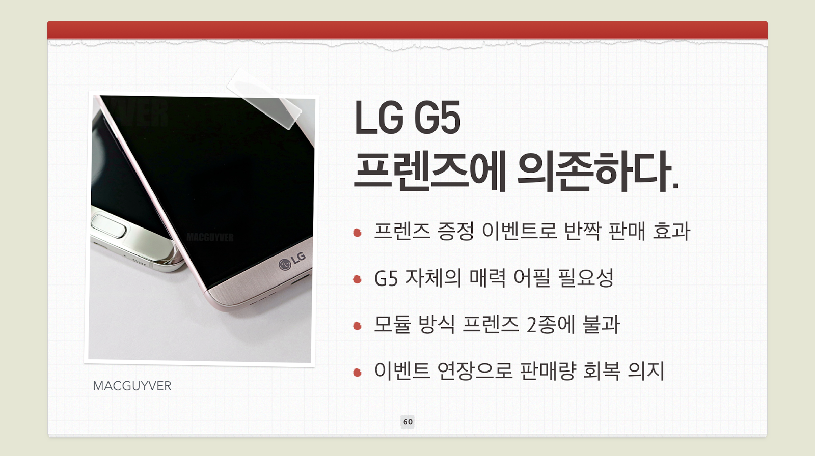 즉, 소비자들이 인식하는 G5의 매력은 G5 자체보다도 G5 + 프렌즈의 조합이었던 것. 하지만 실제 G5와 프렌즈의 조합으로 사용해본 소비자들이 프렌즈에 크게 매력을 느끼지 못하면서 판매량은 서서히 줄어든 것이다.