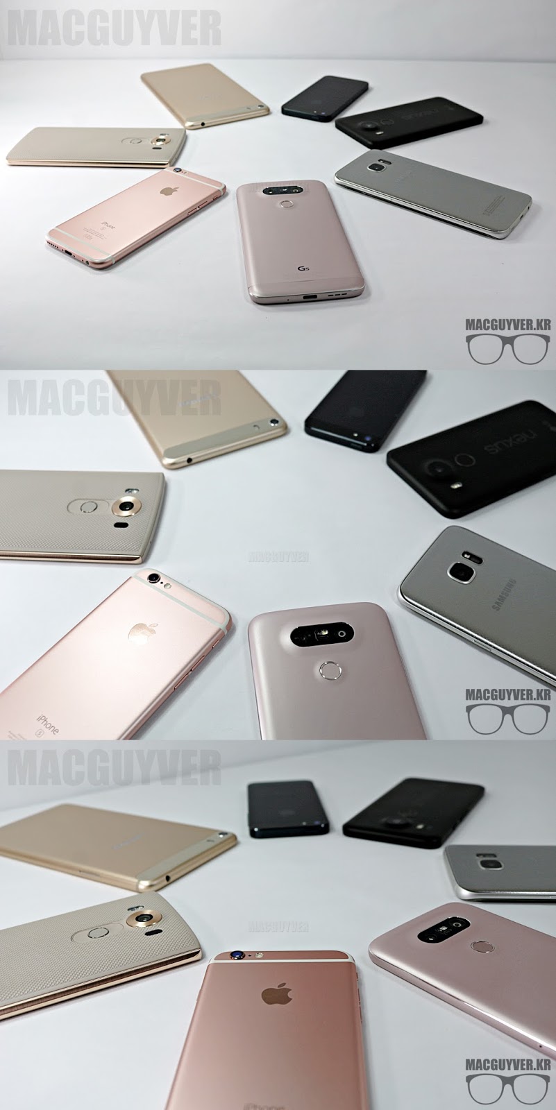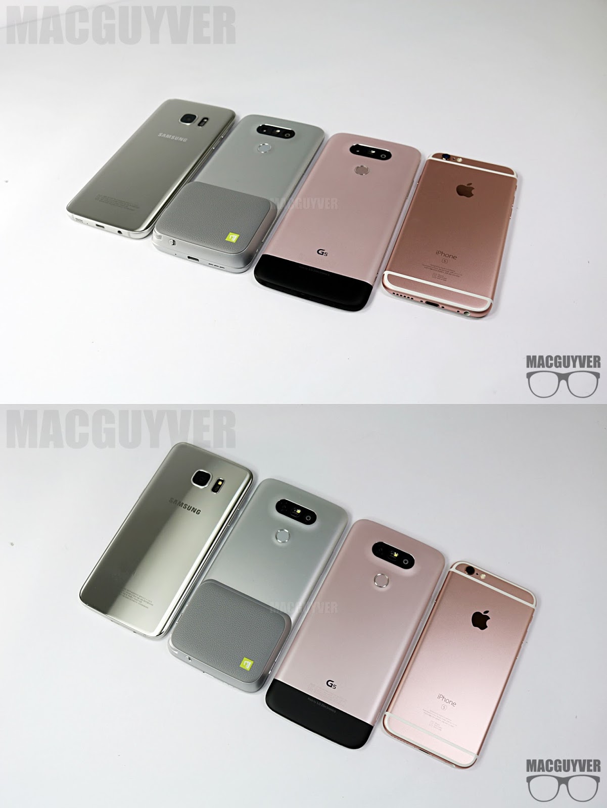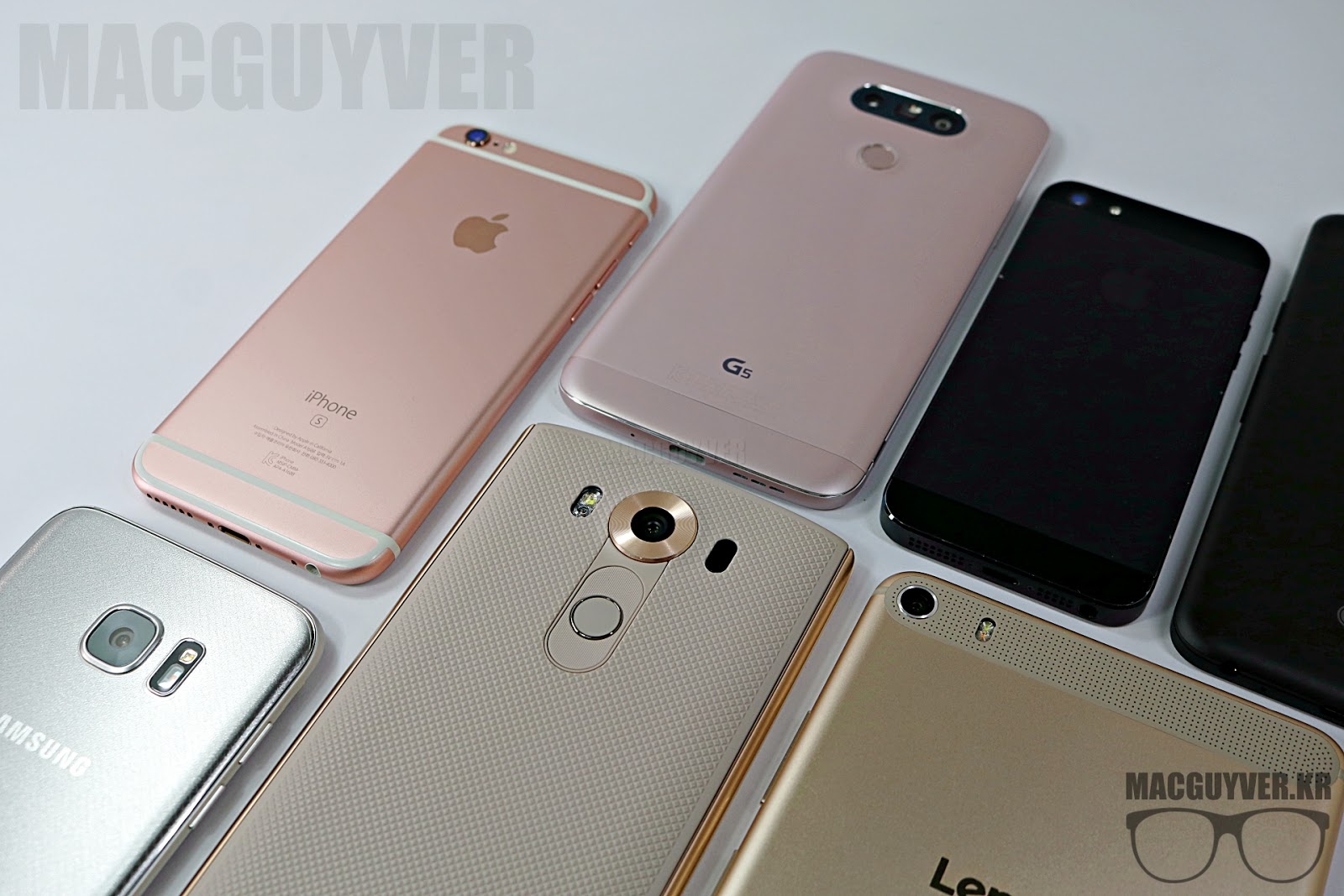 핑크 컬러도 서로 다른 느낌을 주는 아이폰6s와 G5, 반짝이는 갤럭시S7과 G5의 모습이 눈에 띈다 ▼