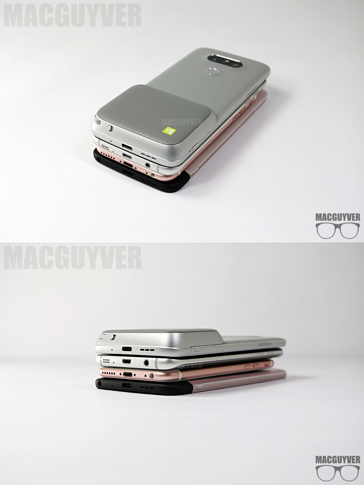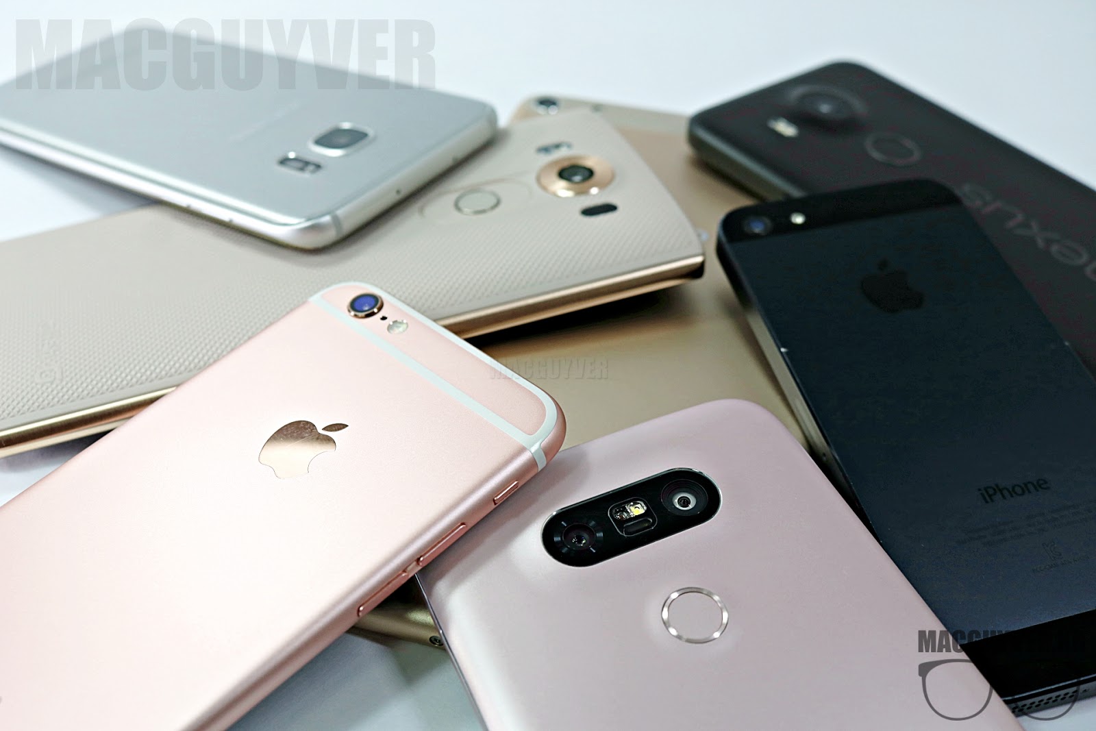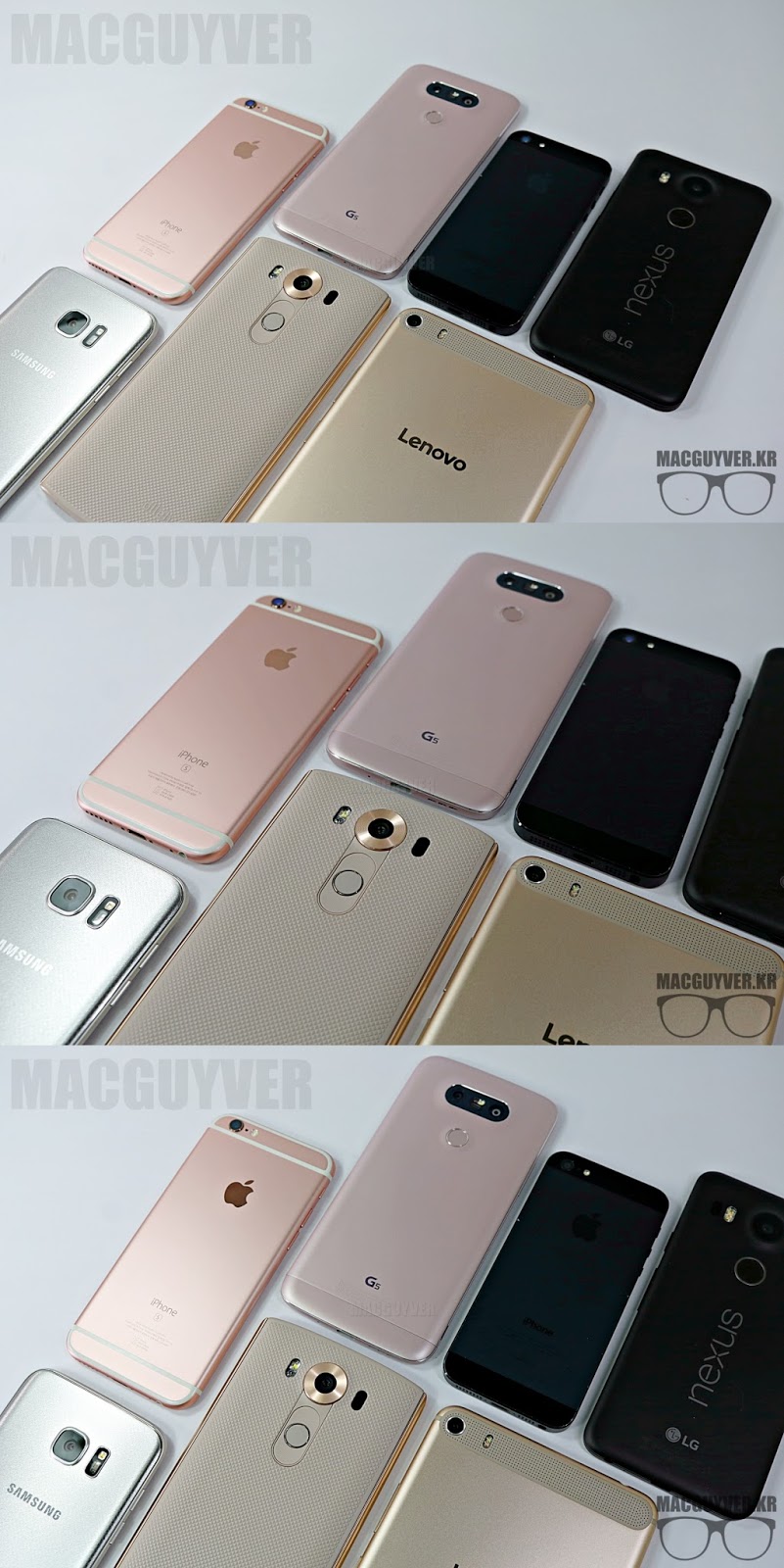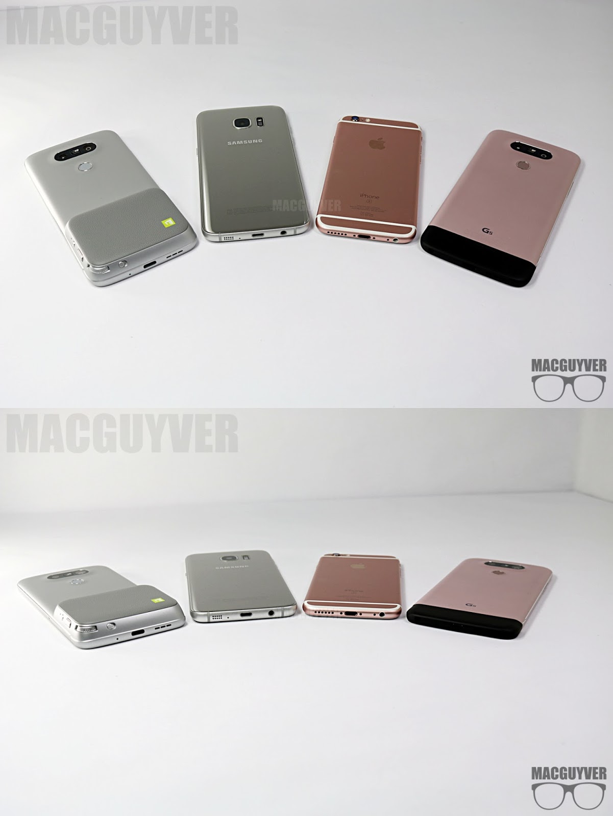 핑크 컬러도 서로 다른 느낌을 주는 아이폰6s와 G5, 반짝이는 갤럭시S7과 G5의 모습이 눈에 띈다 ▼