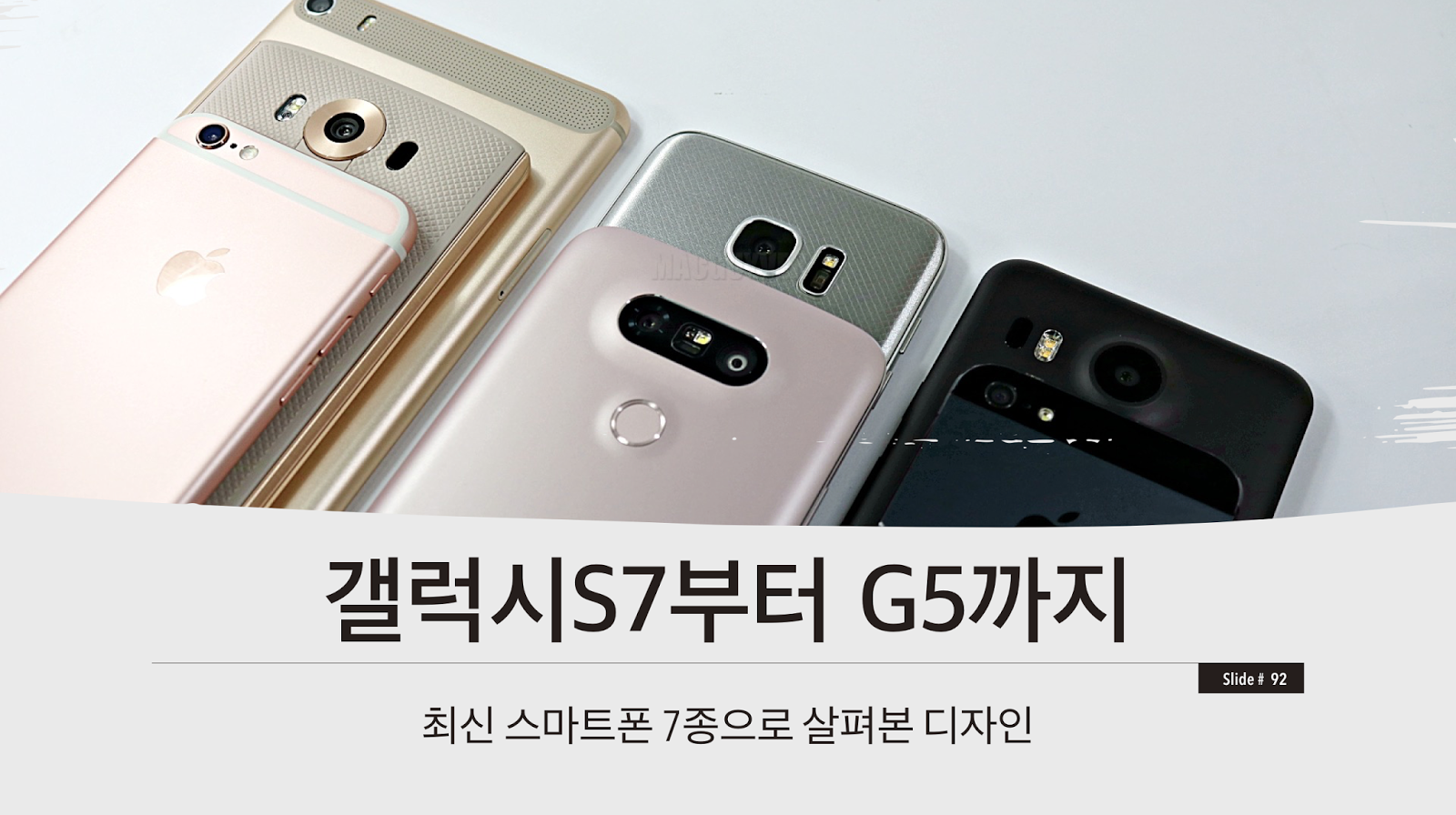 갤럭시S7과 G5 모두 카툭튀를 효과적으로 줄이면서 호평을 얻고 있으며, 베젤이 극도로 얇은 제로 베젤 디자인 역시 요즘의 트렌드라 볼 수 있다. 재질에서도 차이가 나타나고 있는데, 삼성은 유리를, 엘지와 애플은 알루미늄을 내세우고 있다.
