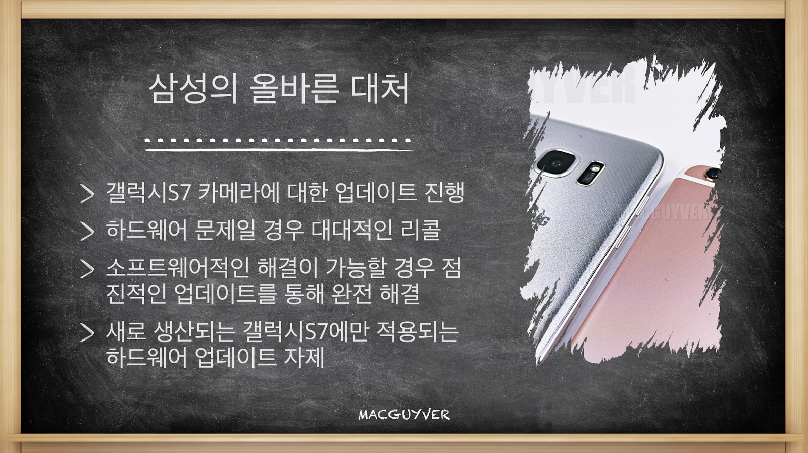 그렇기에, 갤럭시S7 카메라 왜곡 문제를 몰래 개선할 거라면 단연코 말리고 싶다. 그러나 단 한 사람의 소비자라도 소중히 생각한다면, 갤럭시S7 카메라 왜곡은 언제든 해결하기를 바란다. 그것이 소비자에 대한 최소한의 예의일 것이다. - MACGUYVER.