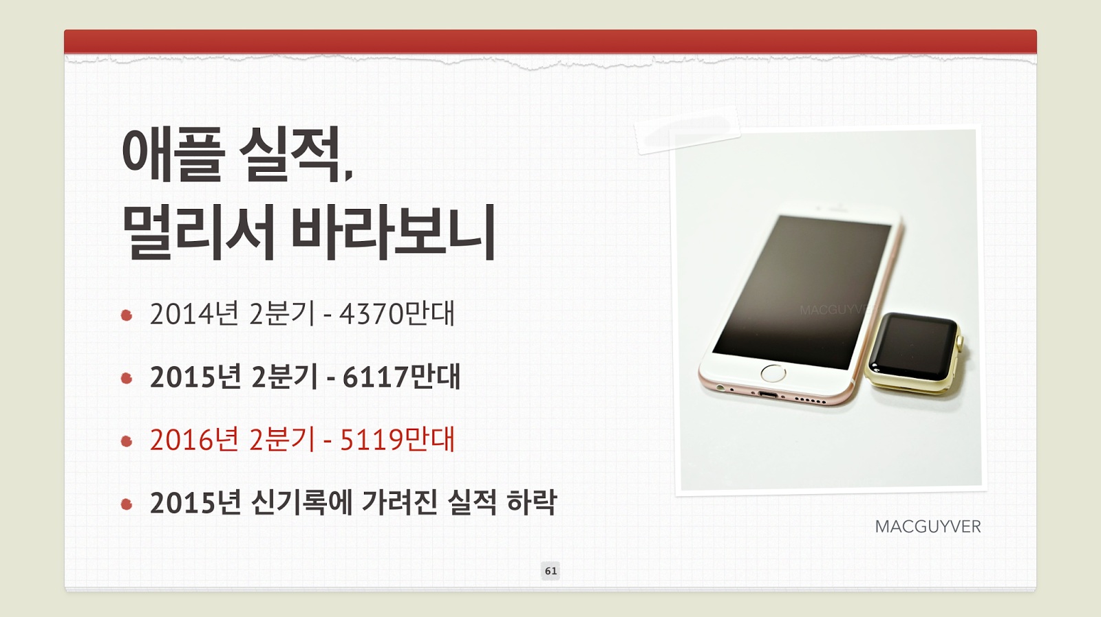결국, 이번 2분기 아이폰 판매량인 5119만대가 적은 것이 아닌, 지난해 아이폰6로의 엄청난 대이동이 이번 분기 실적이 하락한 것처럼 보이게 만든 가장 큰 원인이 되는 것이다.