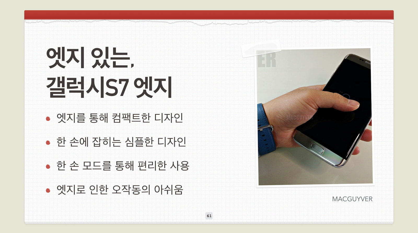 갤럭시S7은 엣지 디자인과 제로 베젤을 통해 폰의 사이즈를 효과적으로 줄인 것은 좋았다. 또한, 전후면 엣지를 통해 그립감도 높였는데, 한 손 모드를 활용할 수는 있지만, 엣지 부분이 오히려 터치에 방해가 되기도 했다.