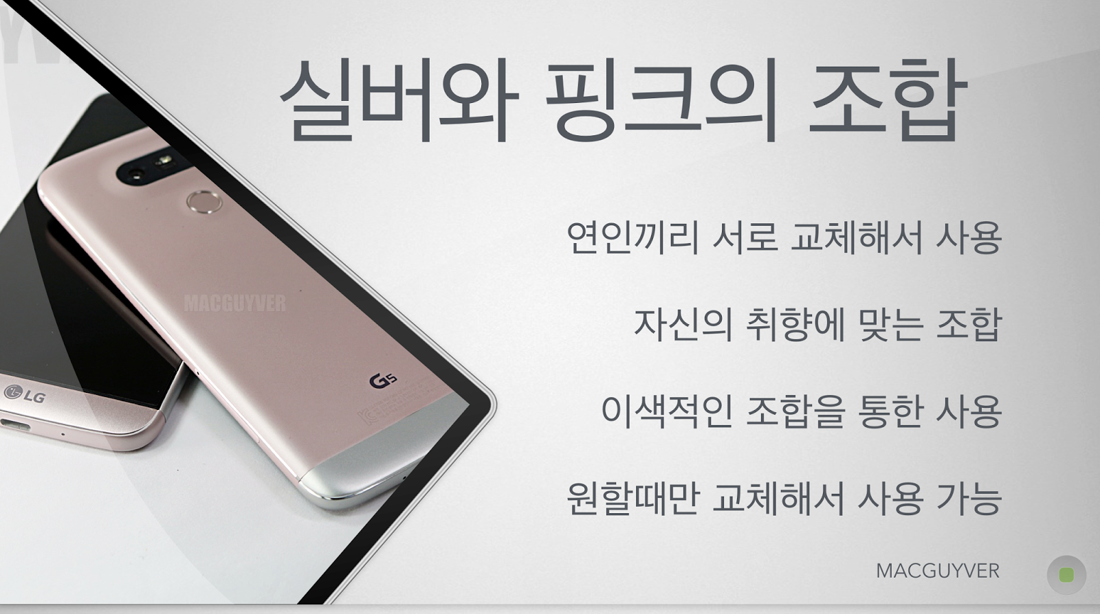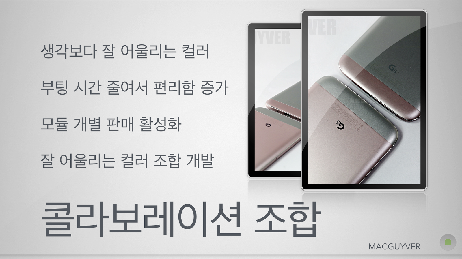 그래서 엘지에서도 더욱 활발한 컬러 마케팅을 할 필요가 있어 보인다. G5의 서로 다른 색상뿐만 아니라 더 다양한 색상의 기본 모듈을 내놓아서 콜라보레이션이 가능하도록 만드는 것이다.