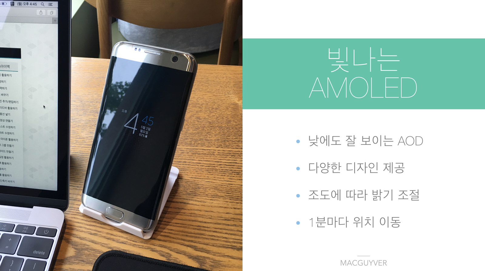 엘지가 먼저 선보였지만 삼성이 제대로 다듬은 올웨이즈 온 디스플레이, 삼성은 역시나 자신이 무엇을 가장 잘하는지를 아는 것 같다. 이제 그 장점을 보다 더 소비자를 향해 기울이기를 바란다. - MACGUYVER.