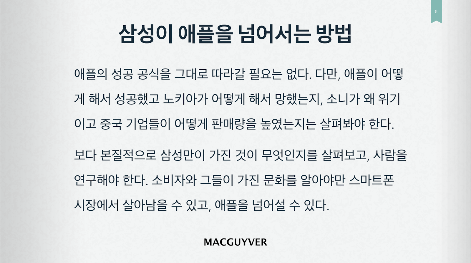 무엇보다, 그 방향성의 중심에 소비자를 놓는 것이다. 소비자를 읽고, 문화를 읽는다면 다른 기업이 예상치도 못한 전혀 다른 제품을 내놓을 수 있을지도 모른다. 그리고 바로 이것이 삼성이 애플을 넘어서는 유일한 단 하나의 방법일 것이다. - MACGUYVER.
