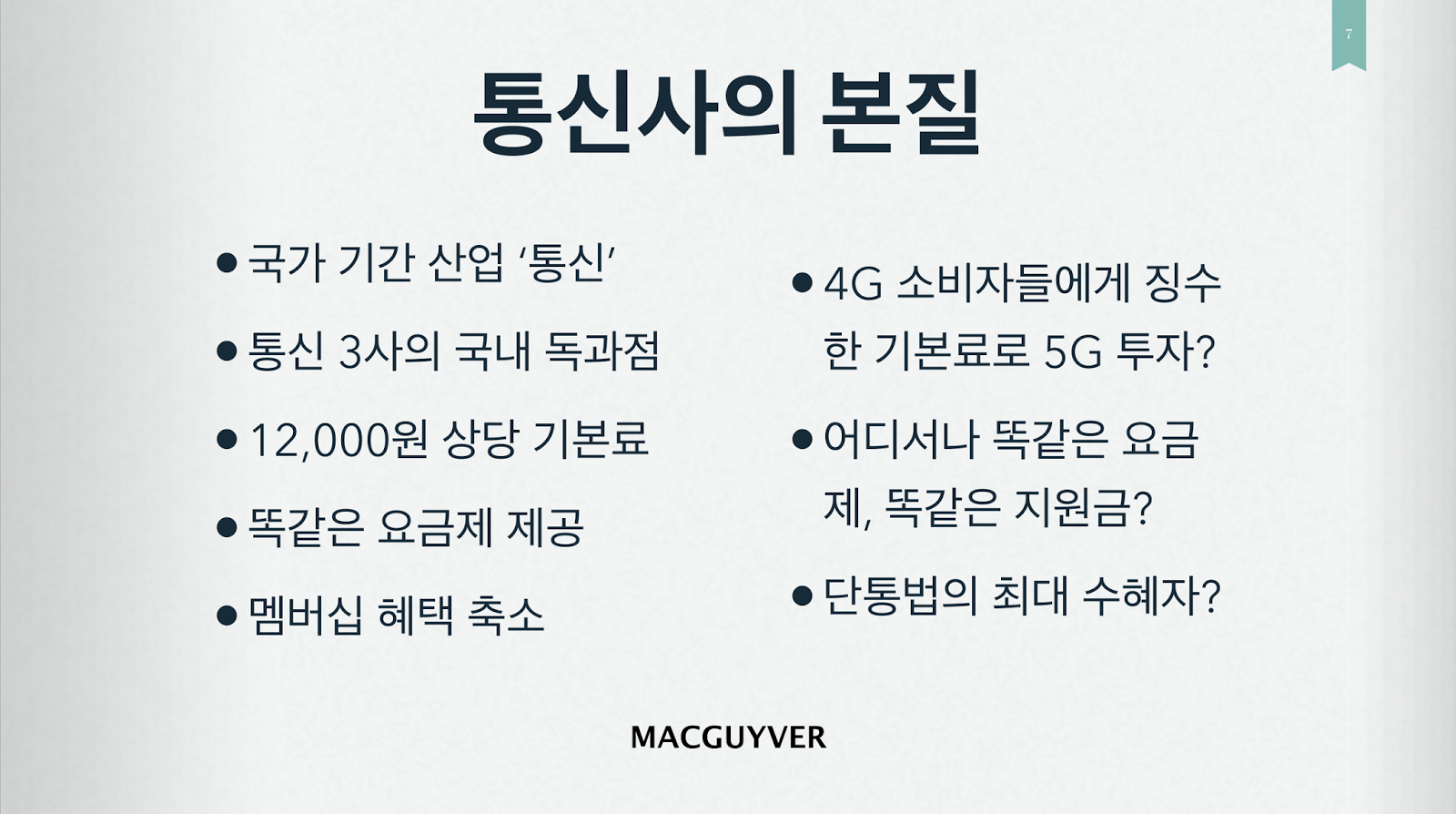 통신사가 경쟁을 해야만 소비자들이 혜택을 보고, 그러한 경쟁이 지속적인 투자를 만들어서 진짜 미래를 안겨줄 수 있음에도, 통신 3사가 나란히 통신 시장을 나눠 먹든 볶아 먹든 그저 강 건너 불구경을 할 뿐이다.