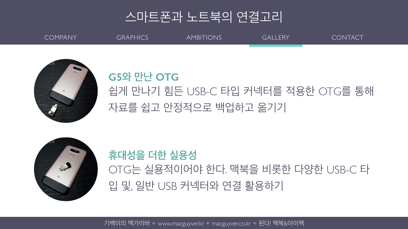 G5에서 촬영한 사진을 바로 옮겨서 맥북에서 작업을 하거나, 맥북에서 작업한 파일들을 가볍게 옮겨서 G5에서 활용할 수 있기 때문에 보안성이 매우 높고, 안정적이며 빠른 속도로 자료를 옮길 수 있다는 편의성이 있다.