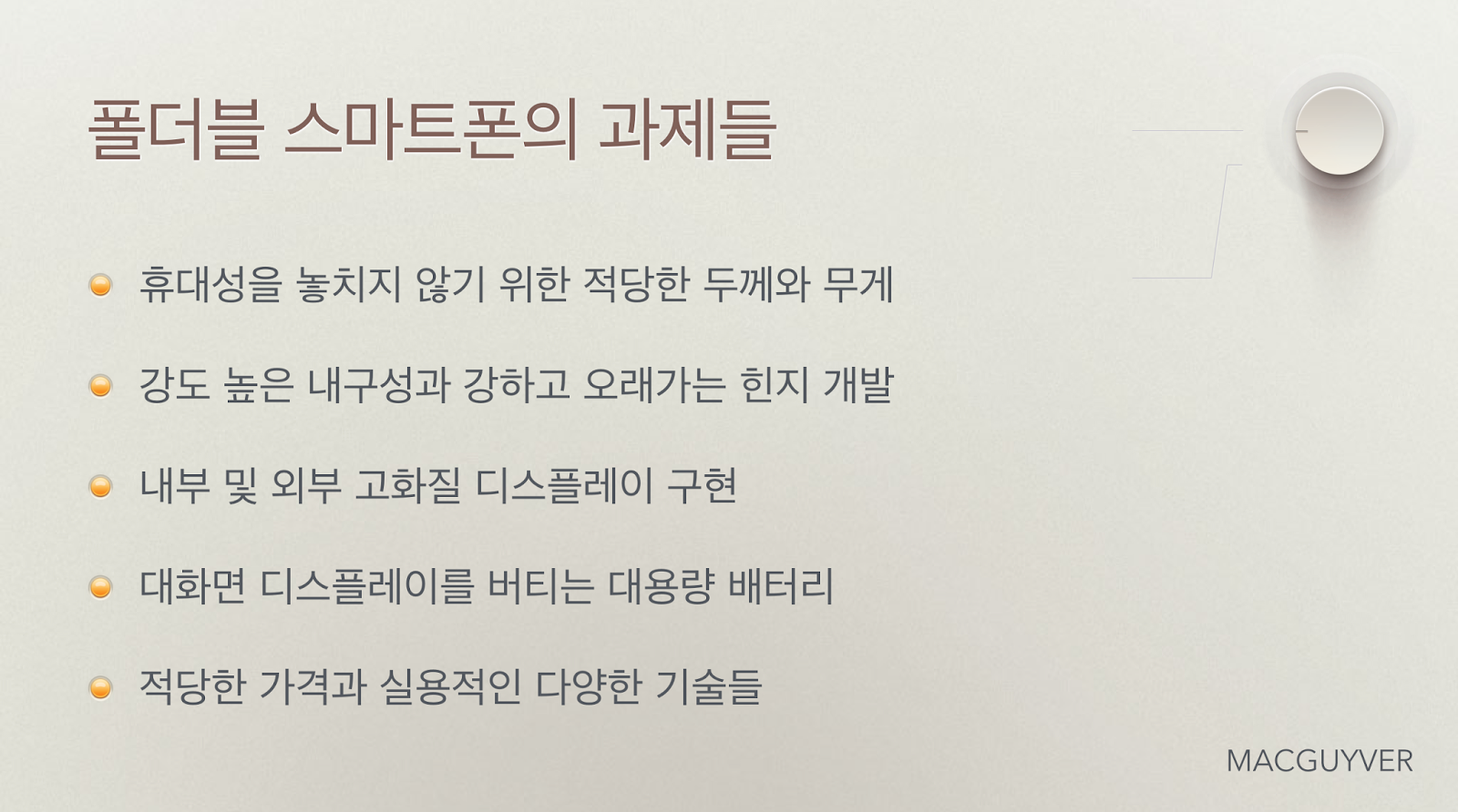 폴더블은 기존의 스마트폰이 가진 모든 장점 그 위에 놓여야만 하며, 그 편리성이 그로 인한 불편을 넘어설 정도가 되어야만 한다. 그래야만 삼성이든 그 어떤 기업이든 진정한 폴더블 스마트폰의 시작을 알리게 될 것이다. - MACGUYVER.