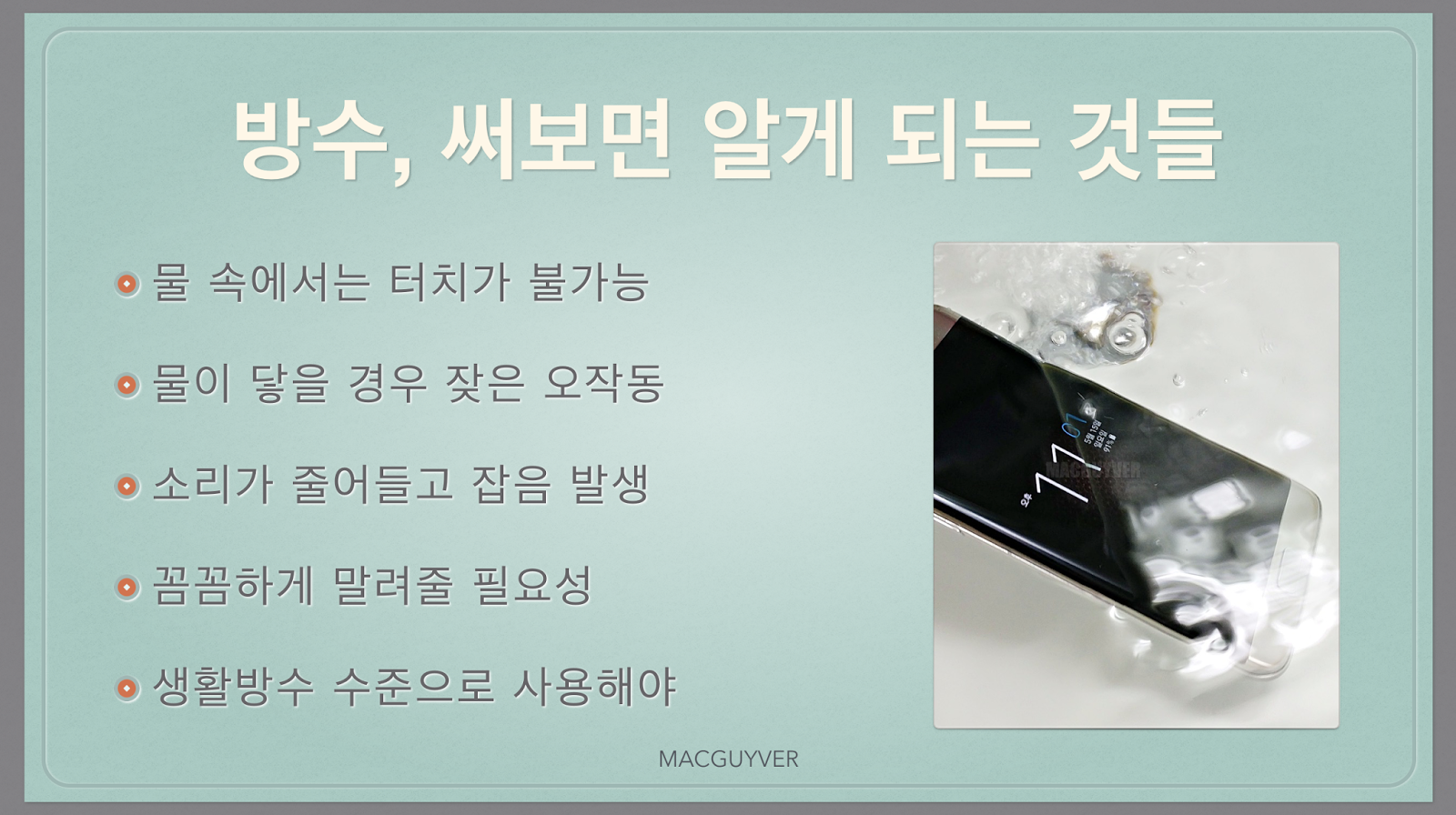 일상적인 수준에서 방수가 가능하며, 가볍게 물에 넣는 수준으로 갤럭시S7의 방수 성능 시험은 그만두는 것이 좋을 것 같다. 아무튼, 비가 와도 물에 빠져도 안심이 되는 갤럭시S7을 제대로 활용해보자. - MACGUYVER.